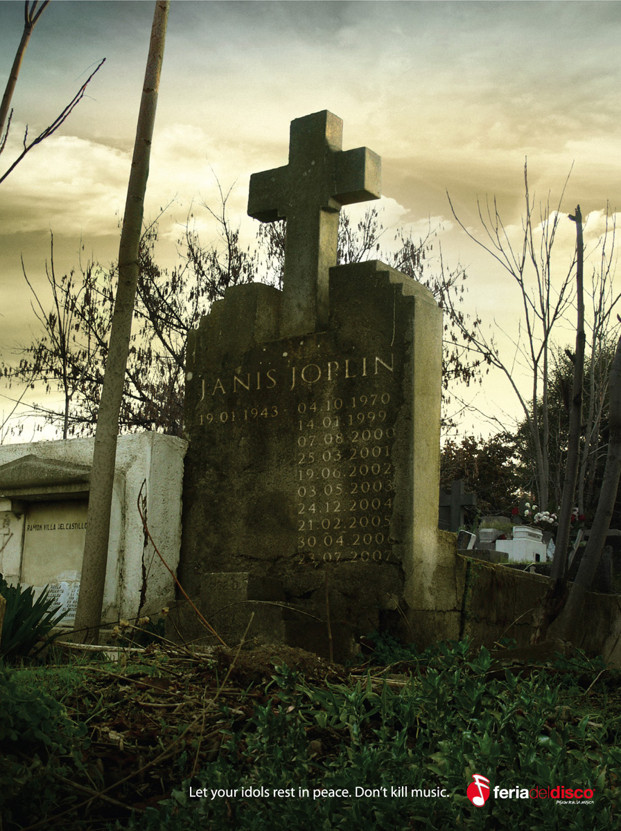 Feria del Disco: ну убивайте музыку!Несколько дат смерти на надгробных плитах таких известных музыкантов, как американский гитарист, певец и композитор Джими Хендрикс (Jimi Hendrix), а также вокалистка Дженис Джоплин (Janis Joplin), говорят нам о том, что эти кумиры уходят из наших сердец и умирают каждый раз, когда мы забываем о них. Чилийское агентство Los Quiltros и музыкальный магазин Feria del Disco призывают нас "не убивать музыку".Надпись: "Дай своим идолам покоиться с миром. Не убивай музыку." Агентство: Los Quiltros, Сантьяго, Чили Творческий директор: Marcelo Feli? Арт директор: Paulo Jerez "Paulaner" Копирайтер: Miguel Ibaceta "Padaone" |
