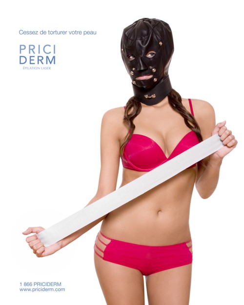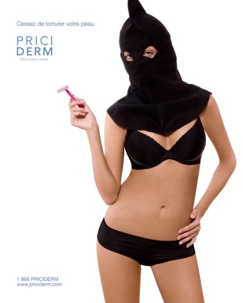 Priciderm: бреются только садисткиЛюбую женщину можно обвинить в садомазохизме, если она применяет такие способы эпиляции, как, например, бритье. Но если вы не хотите быть садисткой и мучить свою кожу, то лазерная эпиляция в клинике Priciderm - это как раз то, что вам нужно.Надпись: "Хватит мучить свою кожу." Агентство: Carte Blanche, Монреаль, Канада Творческий директор: Johann Smith Арт директор: Patrick de Varennes Копирайтер: Johann Smith, Marc-Andr? Tr?panier Фотограф: Jakob Lorenz |