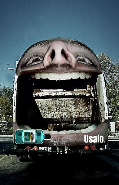 Коммунально-хозяйственный кошмарБренд-менеджеры Listerine, одной из самых сильных марок мирового рынка жидкостей для полоскания зубов, нашли интересую параллель с дурным запахом изо рта. Неблаговонное дыхание, главный, по бренд-легенде, противник продукта компании Johnson & Johnson, крайне невыгодно ассоциируется с разверстой пастью мусороуборочной машины. Поэтому, рассудили в испанском представительстве концерна, заглянув случайно в нутро городского автоассенизатора, чей задок оформлен в виде человеческой головы, гражданин, ревностно следящий за своей гигиеной, немедленно побежит в аптеку за стоматологическими средствами. А надпись "usalo", то есть «используй это», рядом с баллончиком Listerine, не оставит места сомнениям по части выбора марки.![]() KAK.RU |