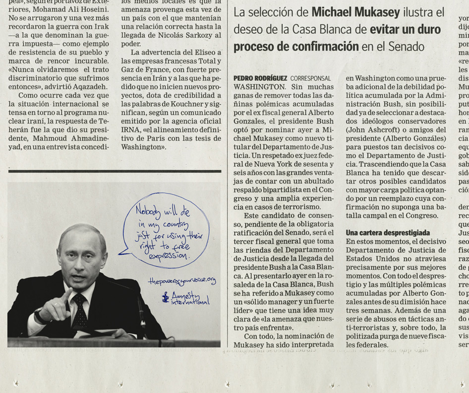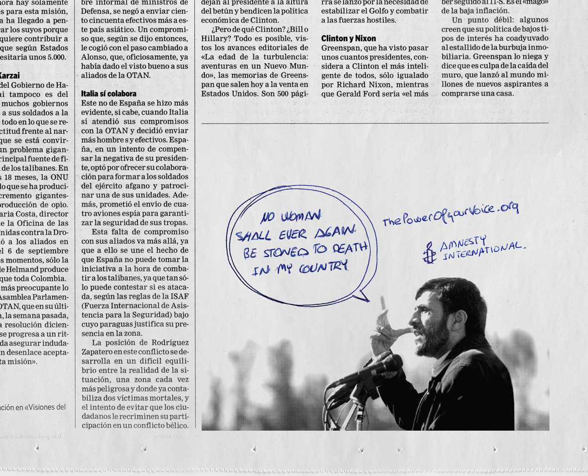 Мечты Amnesty InternationalИспанское агентство Contrapunto в социалке для общественной организации Amnesty International сообщает нам, о чем мечтает эта организация. Например, было бы хорошо, если бы Путин во всеуслышание заявил, что "никто не умрет в моей стране просто за использование своего права на свободу слова", или если бы Буш сказал: "База Гуантанамо незаконна. Мы должны закрыть ее как можно быстрее", а президент Ирана Ахмадинежад пообещал: "Ни одна женщина больше не должна быть побита камнями в моей стране".Агентство: Contrapunto, Мадрид, Испания Главный творческий директор: Antonio Montero Творческий директор: Carlos Jorge, Felix del Valle Арт директор: Carlos Jorge Копирайтер: Felix del Valle Аккаунт-менеджер: Alberto Martinez |