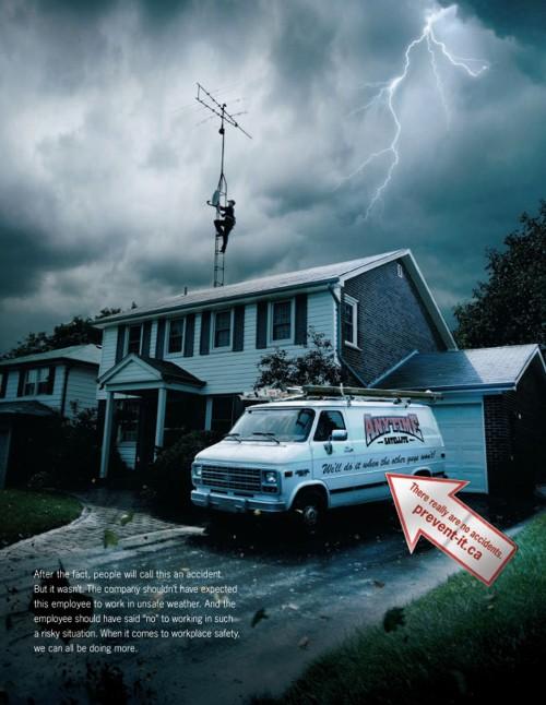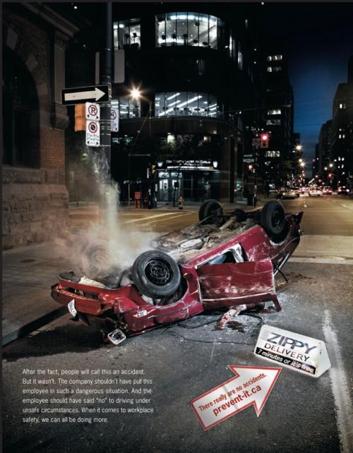 Тэглайн: "There really no accidents. Prevent it" ("Не бывает случайностей. Предотвратите это"). Креаторы FCB Canada не искали обходных путей в донесении сообщения до целевой аудитории, назвав вещи своими именами, сколь бы шокирующим это ни оказалось в итоге. Без цензуры, прямолинейно, и бьет прямо "в лоб". И речь идет о вполне "мирных" профессиях, на первый взгляд не таящих в себе никаких опасностей (шеф-повар или декоратор помещений в магазине). А на деле достаточно невымытого вовремя пятна на полу, чтобы в одну секунду сломать жизнь человеку. В рамках кампании выпущены рекламные принты, также следующие установленной тематике. ![]() Курьер попадает в аварию, стараясь уложиться в указанное службой доставки время ("Быстрая доставка. Доставим за 7 минут, или забирайте бесплатно"). ![]() Кабельщик устанавливает спутниковую тарелку на крыше дома в грозу ("Установка в любое время. Мы делаем это тогда, когда другие отказываются"). ![]() ![]() "По факту, люди назовут это несчастным случаем. Но это не так. Компания не должна подвергать своих сотрудников такому риску. А сотрудники должны говорить "нет", когда начальство заставляет их работать, не исключив перед этим возможность опасных для жизни и здоровья инцидентов. Когда речь заходит о безопасности на рабочих местах, мы все можем сделать больше". ![]() |