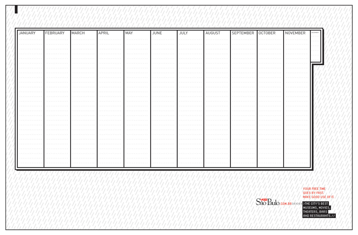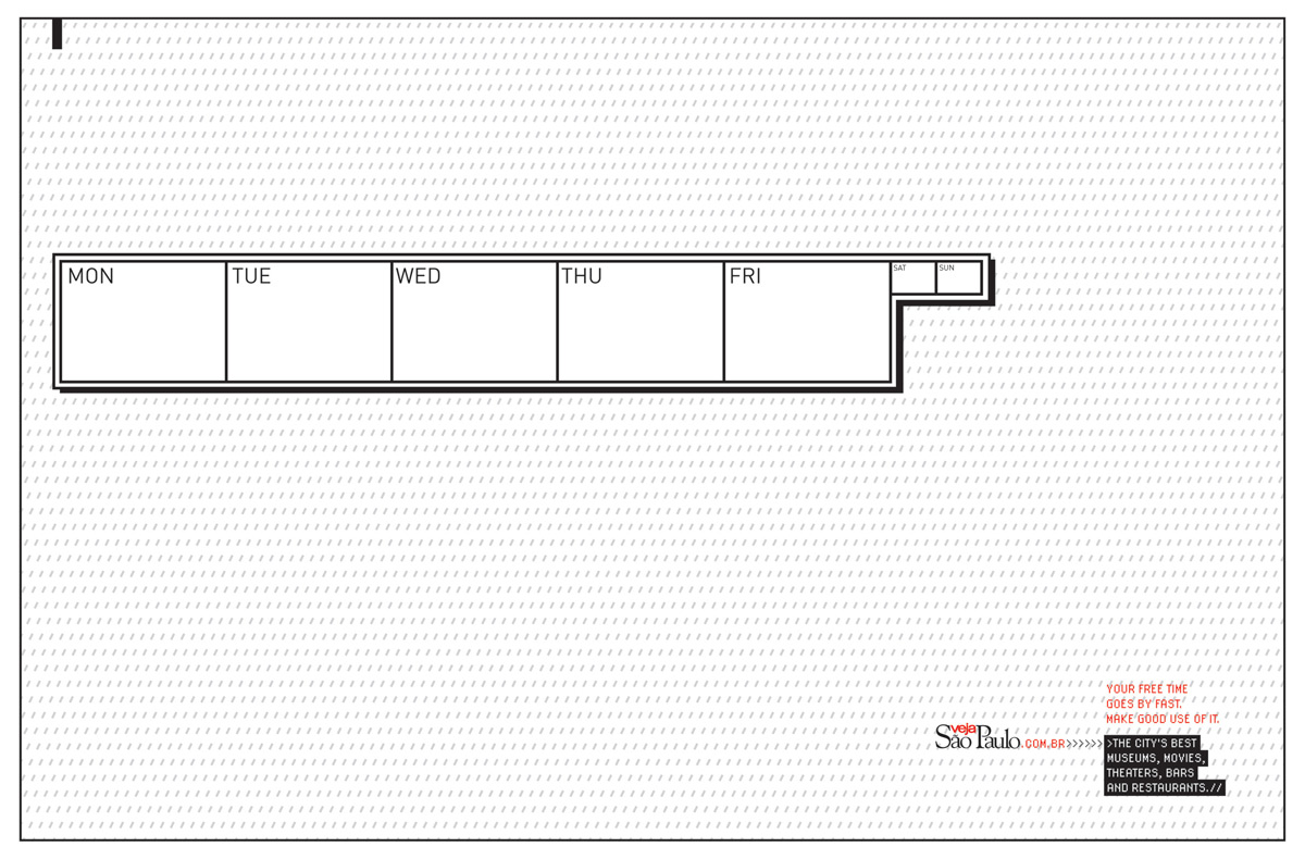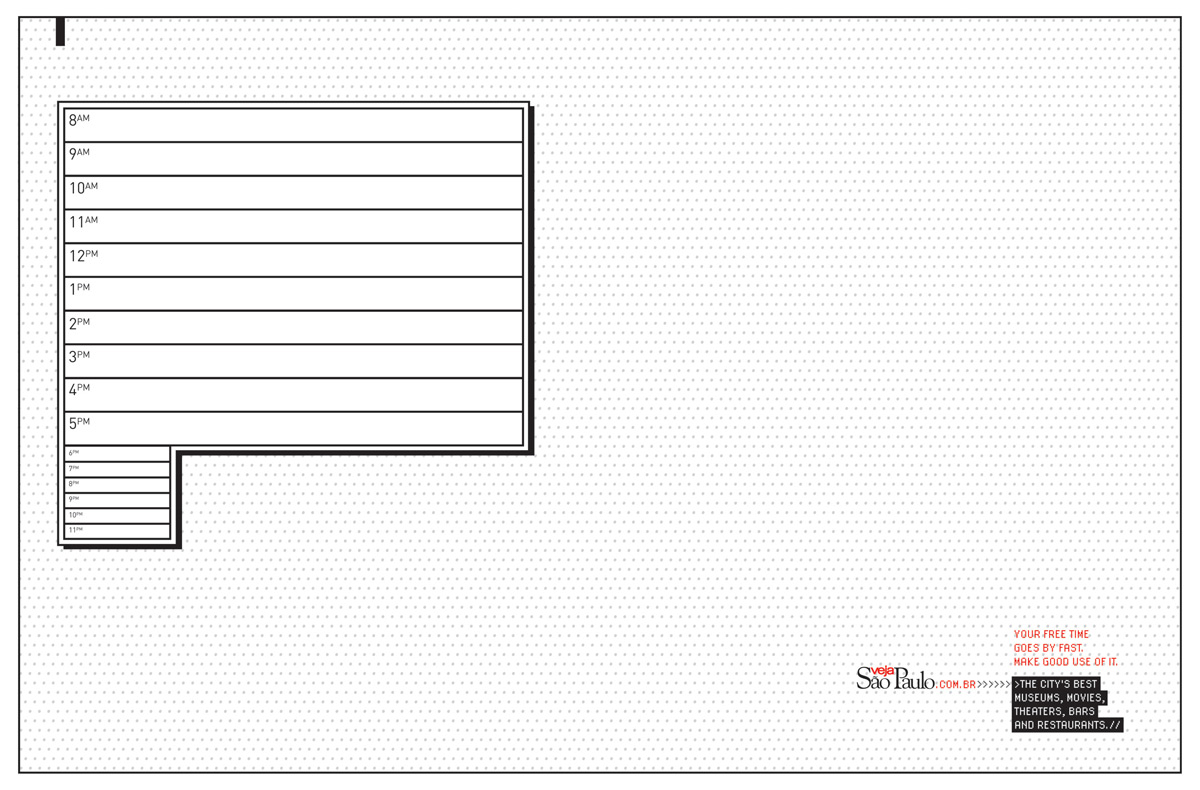 В чем отличие свободного времени от рабочего?Каждый из нас знает, что рабочий день длиться очень медленно, по сравнению с выходными, а отпуск, вообще, пролетает как один день. Именно поэтому бразильское агентство AlmapBBDO советует нам проводить наше свободное время максимально продуманно, а помочь в этом может информационный портал vejaSaoPaulo.com.brНадпись: "Ваше свободное время быстро летит. Используйте его хорошо. VejaSaoPaulo.com.br. Лучшие в городе музеи, кинотеатры, театры, бары и рестораны." Агентство: AlmapBBDO, Сан-Паулу, Бразилия Творческий директор: Rodrigo Almeida, Tales Bahu Арт директор / Иллюстратор: Danilo Boer Копирайтер: Romero Cavalcanti |