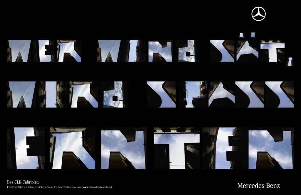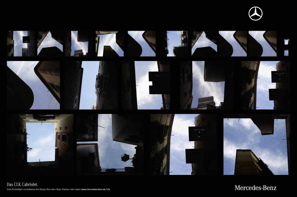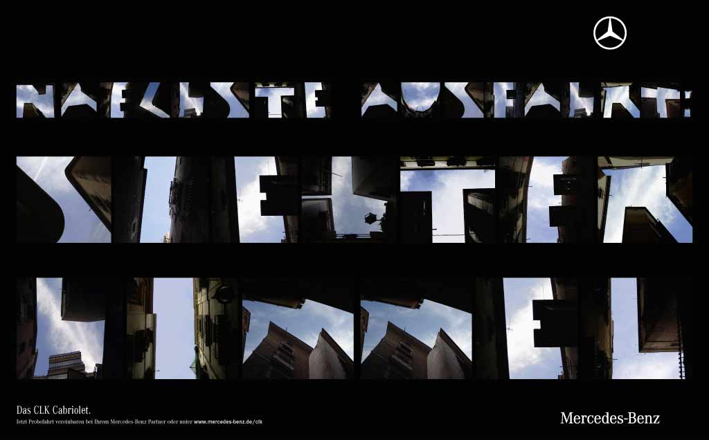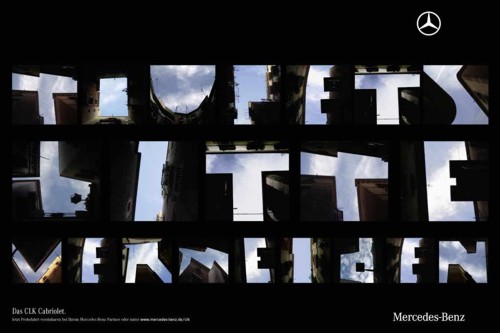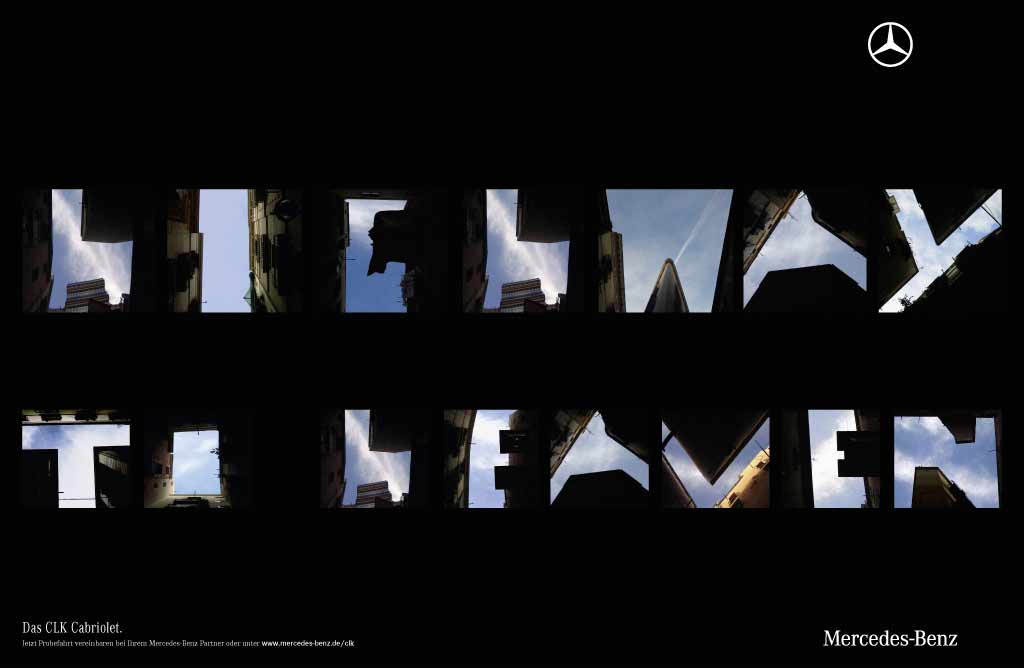 Кабриолет Mercedes-Benz: смотри выше!Чтобы показать все прелести кабриолета CLK от Mercedes-Benz, немецкое агентство Jung von Matt решило использовать фотографии домов, из которых и сложились надписи на этих принтах, например, "Дорога в рай" или "Веселись за рулем: смотри выше".Агентство: Jung von Matt, Германия Творческий директор: G?tz Ulmer, Fabian Frese, Oliver Voss, Deneke von Weltzien Арт директор: Lisa Rienermann, Julia Ziegler Копирайтер: Jan-Florian Ege, Ron Kanecke, Jan Geschke, Daniel Pieracci, Stefan Fockenberg Фотограф: Lisa Rienermann |