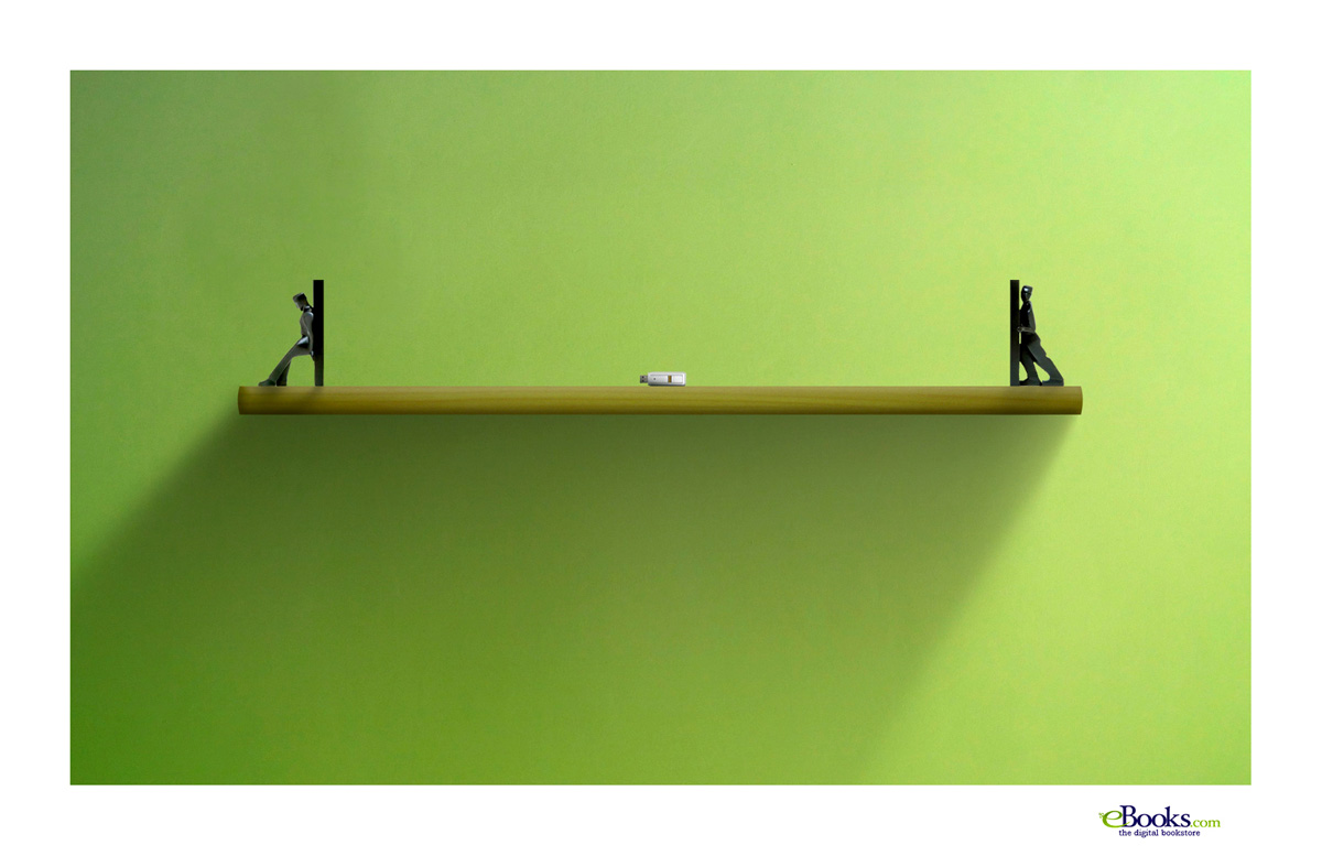 ebookstore.com: книжные полки теперь не нужны!Книжные полки вам больше не понадобятся, если вы покупаете литературу в интернет-магазине ebookstore.com. Дело в том, что вся продукция продается в цифровом формате и поэтому вместо книжной полки достаточно обычной флэшки.Надпись: "Цифровой книжный магазин." Арт директор: Jo?o Pedro Tonini |