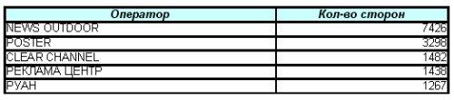 60% средств наружной рекламы сконцентрировано в спальных районах, 40% - в центре. Что касается операторов, работающих на рынке «наружки», то по итогам сентябрьского мониторинга рынка Петербурга, первую пятерку лидеров по количеству рекламных поверхностей возглавляет News Outdoor (7426), с довольно большим отрывом за ним идет «Постер» (3298), примерно одинаковое количество рекламных поверхностей у Clear Channel (1482) и «Рекламы Центр» (1438), замыкает топ-5 лидеров Корпорация «Руан» со своими 1267 рекламными поверхностями. |
