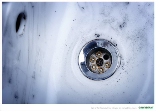 Greenpeace против загрязнения сточных трубЗагрязнение сточных труб не предназначенными для этого вещами может привести к серьезным последствиям для природы, считает общественная организация Greenpeace. Чтобы визуализировать эту мысль, румынское агентство Starlink Group показывает нам раковину, в сток которой отправляются путешествовать настоящие пули.Надпись: "То, что вы бросаете в сточную трубу, убивают природу." Агентство: Starlink Group, Будапешт, Румыния Творческий директор: Stefan Voloaca Арт директор: Catalin Burcea Копирайтер: Andrei Gurau Иллюстратор: Catalin Burcea |