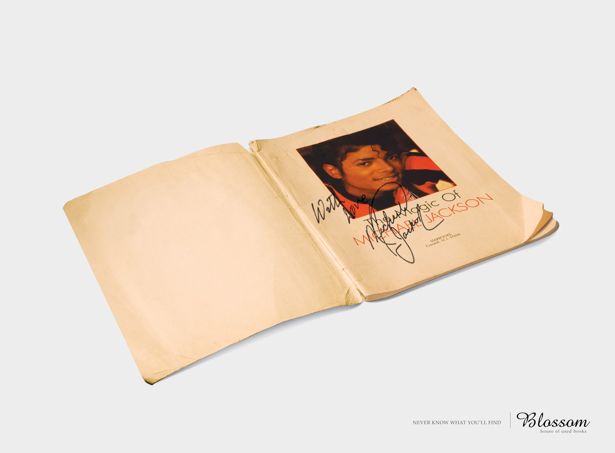 Никогда не знаешь, что найдешь в подержанных книгах из магазина BlossomЧтобы заинтересовать потенциальных покупателей дома подержанной книги Blossom, индийское рекламное агентство Triton Communications показывает нам, что в старых книгах можно найти много чего интересного, например, автограф Майкла Джексона.Надпись: "Никогда не знаешь, что найдешь. Дом подержанной книги Blossom." Агентство: Triton Communications, Бангалор, Индия Творческий директор: Sanjoy Datta Арт директор: Jayaraman, Pratheeb Ravi Копирайтер: Vaishnav Balasubramaniam Фотограф: Paul |