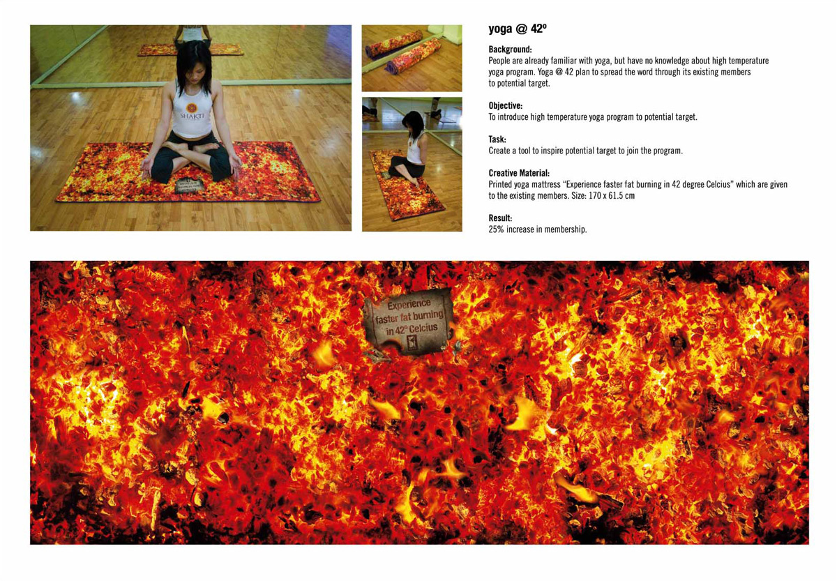 Йога на открытом огне от агентства Neo IndonesiaСпециальные программы йоги при высоких температурах позволяют более эффективно сжигать жир, а чтобы сообщить об этом ЦА, агентство Neo Indonesia разработало для клуба Yoga @ 42 специальные коврики для йоги, сидя на которых у человека создается такое впечатление, как будто его поджаривают на открытом огне.Надпись: "Испытай быстрое сжигание жира при 42 градусах." Агентство: Neo Indonesia Творческий директор: Dedy Suherdi Арт директор: Alvin Dharmawan Копирайтер: Ichwan Rinaldi, Millaty Ismail Фотограф: Gerard Adi Цифровая обработка: C! Production, Herry Thamrin |