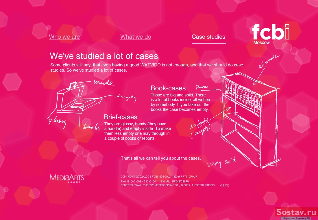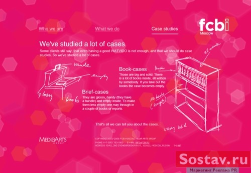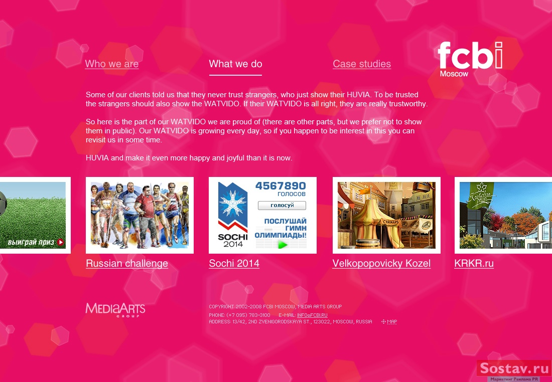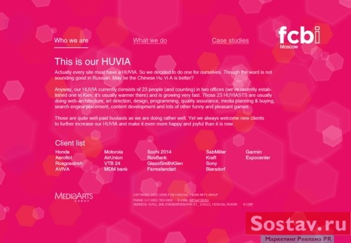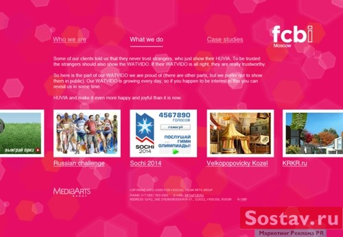FCBi обновила корпоративный сайт www.fcbi.ruКомпания FCBi, входящая в коммуникационный холдинг Media Arts Group, обновила дизайн своего корпоративного сайта. Новый дизайн выполнен в соответствии с фирменным стилем. Теперь сайт содержит все необходимые разделы: HUVIA, WATVIDU и CASE STUDIES. Насыщенный малиновый цвет обозначает принадлежность к глобальной сети FCBi и приверженность ценностям творческого подхода к решению задач по повышению эффективной отдачи от вложений клиента в Интернет-рекламу. При программировании сайта применены элементы передовой технологии "флеш", позволяющие придать визуальной информации яркую эмоциональную окраску.Состав творческой группы Директор Интернет департамента - Андрей Васин Арт-директор - Ден Гришин Копирайтер и иллюстратор - Владимир Коровкин Flash -дизайнер - Дмитрий Чуриков Flash-технолог - Константин Станишевский Технический дизайнер - Сергей Лесков |