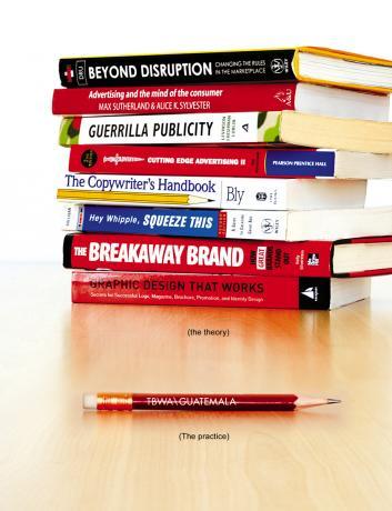 Где практика побеждает теориюВ рекламе агентства TBWA стопки учебных буклетов не стоят ничего рядом с простым предметом - карандашом, который олицетворяет практику. Только с опытом приходит понимание, считает TBWA.Состав творческой группы Рекламное агентство: TBWA Guatemala Творческий директор/Копирайтер: Luis Felipe Asteguieta T. "Tigui" Фотограф: Silvia Urruela