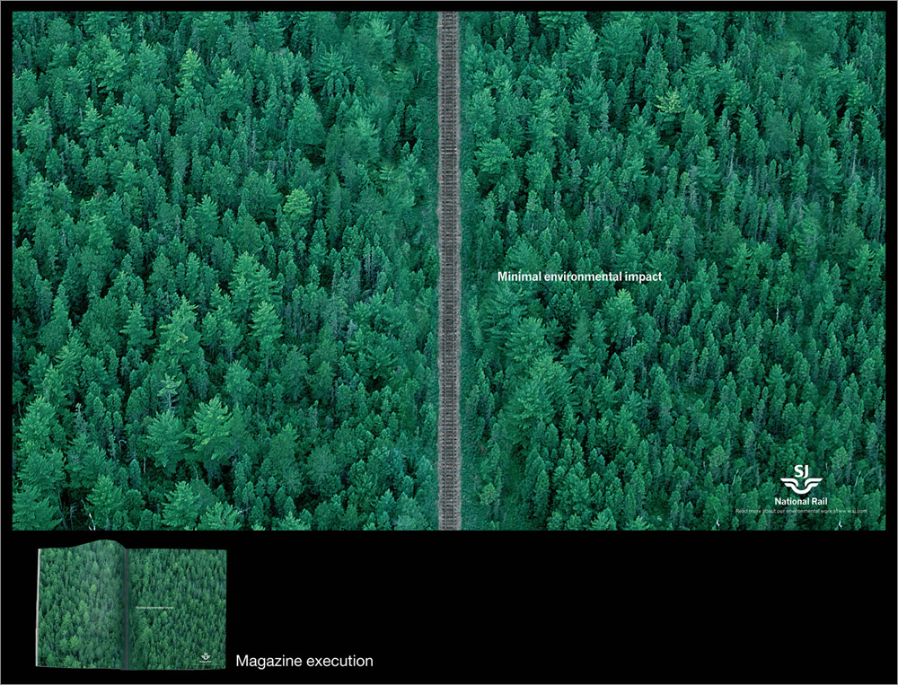 Зеленый разворот для рекламы железнодорожной компании National RailЧтобы показать жителям Швеции, что национальная железнодорожная компания National Rail оказывает минимальное воздействие на окружающую среду, агентство King создало поистине зеленый разворот для рекламы в журналах, на сгибе которого пролегает железнодорожное полотно.Надпись: "Минимальное воздействие на окружающую среду." Агентство: King, Стокгольм, Швеция Творческий директор: Frank Hollingworth Копирайтер: Niclas Carlsson, Christian Karlsson Арт директор: Josephine Wallin, Tommy Carlsson |