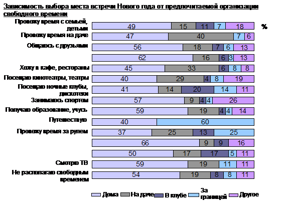 Как москвичи планируют праздновать Новый годДекабрь, 2007Исследование было сфокусировано на выявлении планов празднования Нового года среди москвичей. Сбор информации осуществлялся методом опроса среди 450 человек. Ежегодно на кануне Нового года люди решают, где и с кем будут его праздновать. Сейчас есть огромный выбор мест встречи Нового года, на любой вкус и на любой бюджет. По результатам исследования исследовательской компании MAR Consult были определены, наиболее популярные способы встречи праздника. По-прежнему большинство людей предпочитают традиционно встречать Новый год дома в уютной и привычной обстановке (54%). Часть людей планирует праздновать на природе, и уедут на дачу (14%). Небольшое количество москвичей проведут Новый год в клубах (8%) и за границей (8%). Почти десятая часть опрошенных до сих пор не определилась, где будет встречать праздник, а 5% в новогоднюю ночь будут работать. Незначительная часть опрошенных выбрала, например, такие места, как: гостиница, гости, Санкт-Петербург и др. В большинстве случаев Новый год встречают с друзьями (49%) и родственниками (42%), реже с коллегами по работе (7%), а 2% опрошенных будут встречать новый год в одиночестве. Большинство людей не зависимо от возраста, дохода и способов проведения свободного времени планируют встречать Новый год дома. Возраст респондента влияет на выбор способа организации новогоднего праздника. ![]() Респонденты в возрасте до 18 лет в большинстве случаев отмечают новый год дома (66%) в кругу родных и друзей или на даче (15%). От 18 до 35 лет респонденты более разнообразны в выборе места встречи Нового года: помимо наиболее популярных - дома (55%) и на даче (23%), также будут праздновать за границей (13%) и в клубах (9%). Респонденты старшей возрастной категории предпочитают домашний уют в новогоднюю ночь. При выборе места встречи нового года определенное значение имеет образ жизни человека, то как он проводит свое свободное время. ![]() Среди тех, кто предпочитает встречать Новый год дома, большинство составляют респонденты, которые свободное время проводят с семьей и детьми, за чтением книг и просмотром телепередач (в среднем 72%). На даче Новый год в большинстве случаев встречают те, кто проводят там большую часть своего свободного времени (40%). В клубе Новый год встречают в основном любители клубной жизни и дискотек (20%). За границей Новый год встретят любители путешествий (60%) и те, кто большую часть свободного времени проводят за рулем (25%). На выбор способа организации новогоднего праздника влияет уровень материального достатка семьи. ![]() Среди респондентов с суммарным среднемесячным доходом семьи до 25 тыс. рублей подавляющее большинство встречает Новый год дома. Чем выше уровень доходов семьи, тем более распространены разнообразные способы встречи Нового года, тем меньше отдается предпочтение традиционной домашней обстановке в новогоднюю ночь, и выше приоритетность клубного и заграничного отдыха в праздник. Высокая распространенность среди респондентов домашней организации новогоднего праздника связана с материальным положением опрошенных и со сложившейся традицией считать Новый год семейным, домашним праздником. |