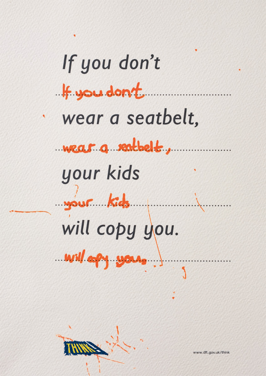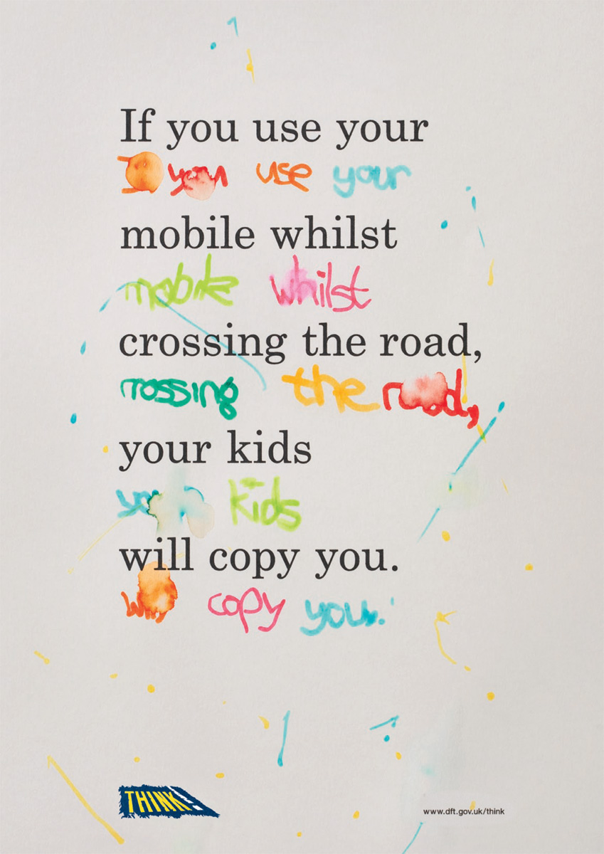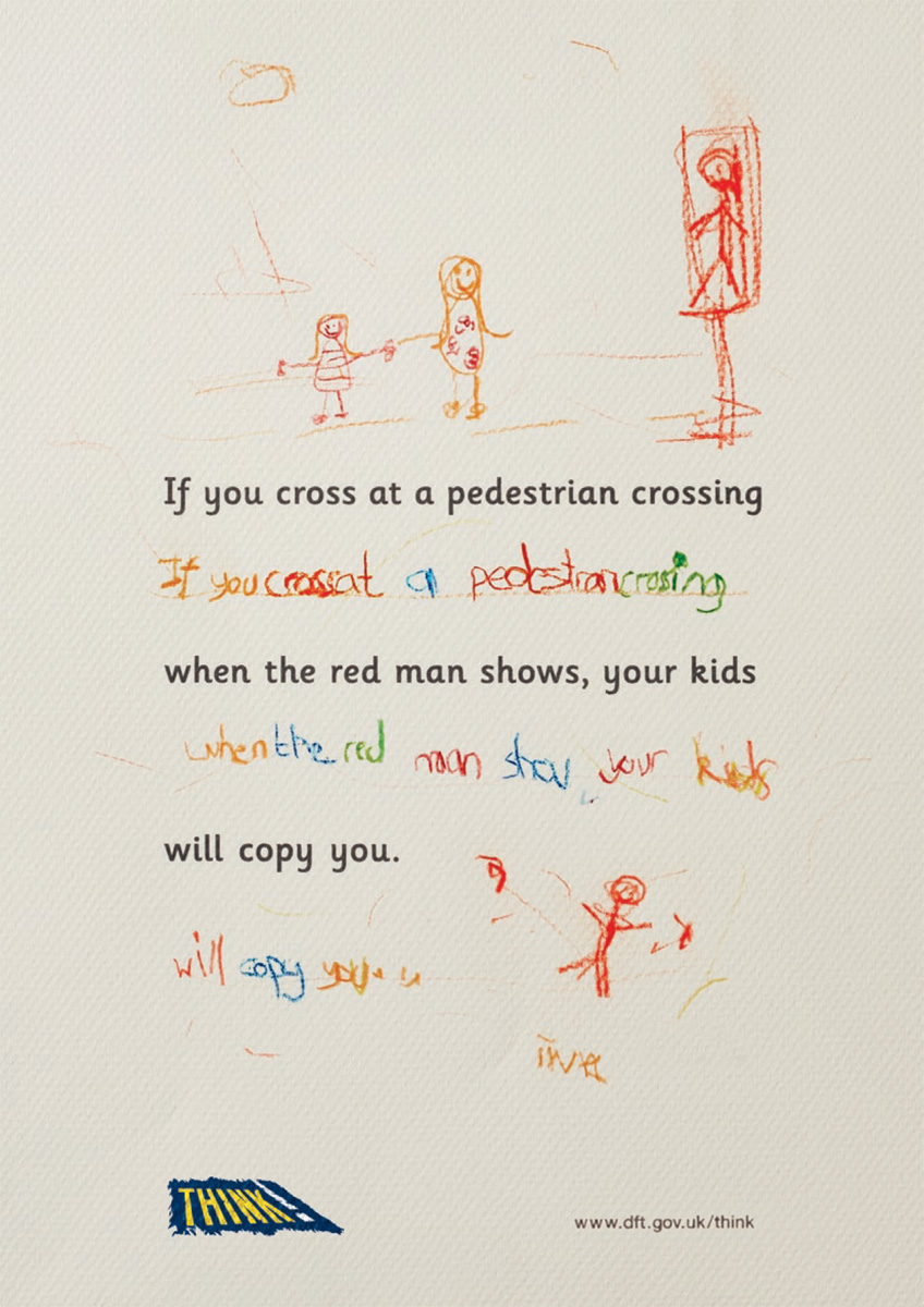 Организация Think и агентство Leo Burnett рассказали про детей-повторюшекВзрослея и обучаясь, дети очень часто копируют действия взрослых, именно поэтому так важно не преподать детям плохой пример, переходя улицу на красный свет или не пристегивая ремни безопасности. Именно эту мысль пытается донести до нас английское агентство Leo Burnett, представившее эти принты.Надпись: "Если не пристегнешься, твои дети сделают также. Если перейдешь на красный свет, твои дети сделают также. Если будешь болтать по телефону, переходя улицу, твои дети сделают также." Агентство: Leo Burnett, Лондон, Великобритания |