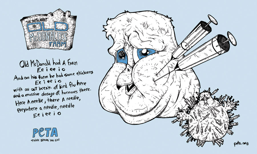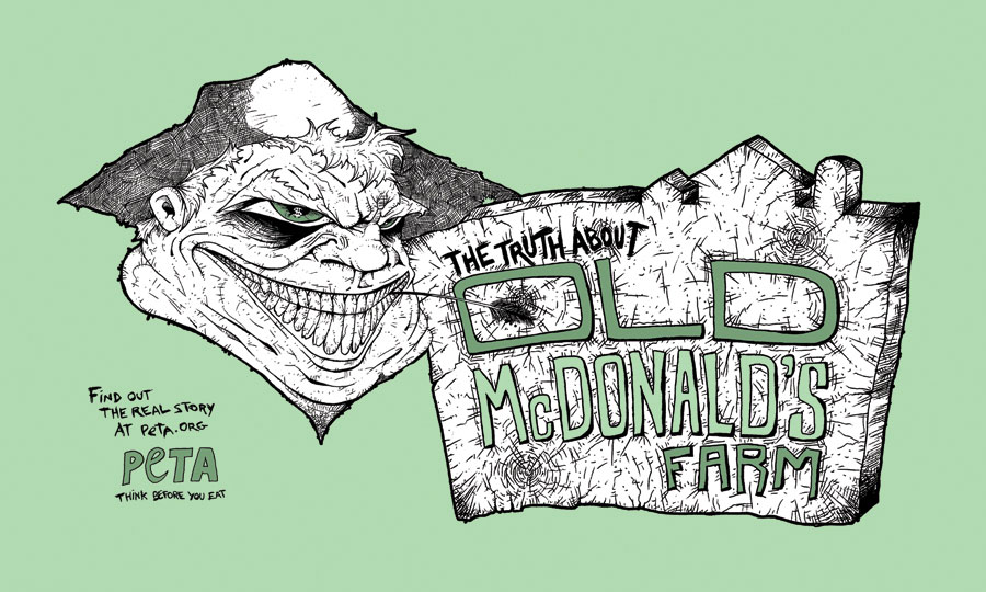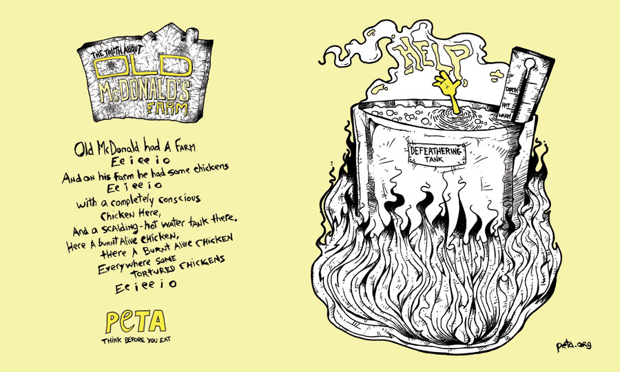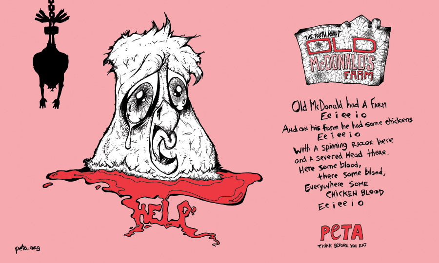 PETA: веселые песни о страшном или что делает Рональд Макдональд в своих застенкахОбычные люди совершенно не представляют себе, каково приходится несчастным курам, из которых делают продукцию ресторана быстрого обслуживания McDonald's. На "ферме старого Макдональда" птицам отрезают головы и варят их заживо, перед этим наколов их гормонами. Обо всех этих ужасных вещах можно узнать из представленных перед вами веселых песенок от организации PETA.Надпись: "Вся правда о ферме Старого Макдональда." Арт директор / Копирайтер / Иллюстратор: Jay Marrotte |