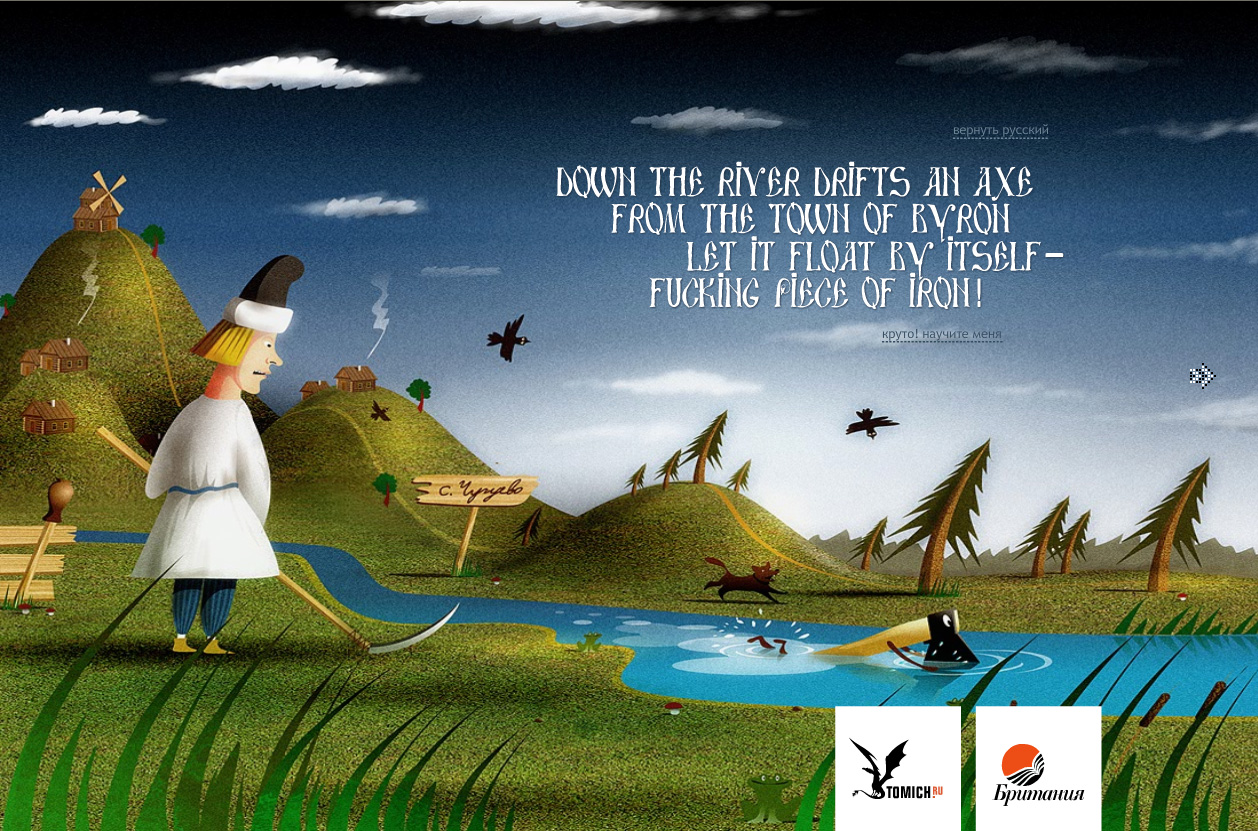 Как с помощью голенькой девицы, лежащей с Коленькой на сеновале, выучить английский? Школа иностранных языков использует мат, потому что это модно"Оригинальный" способ для продвижения услуг по изучению английского языка в среде его носителей избрали "Томич.ру" и "Британия" в своем совместном проекте "Плохие стихи".Попав на сайт, иной лингвист растеряется или даже возмутится, однако, истинным любителям и ценителям колоритных особенностей великого и могучего придется по душе необычный портал. На нем представлены 11 страниц, каждая из которых создана различными дизайнерами и иллюстраторами с использование разных техник, отчего все они разняться по своему стилю и настроению. На каждой странице находится стишок, который посетитель сайта при желании одним нажатием переведет на рифмованный английский. А стихи эти не обычные, а всем нам знакомые шедевры нецензурно-дворового заборного фольклора, цитирование которого каралось в свое время шлепаньем по губам, записями в дневнике и прочими педагогическими зверствами. На сайте переводу на язык Шекспира подверглись частушки про топор из села Чугуево, про дядю, дельфина и буй, про тещу, зять которой, проходя мимо ее окон, непременно старается развеселить свою родственницу заголением различных срамных частей тела, а также прочие шедевры непечатного народного творчества. Цель сайта - продемонстрировать преимущества изучения иностранного языка в среде его носителей, а заодно и прорекламировать компанию "Британия", которая специализируется на таком виде услуг. Эти стишки в литературном английском переводе и раньше встречались в сети, например на сайте www.barynya.com. Что касается авторов иллюстраций, то оживлением этого стихотворчества занимались Даша Авдеева, Оля Баранова Денис Бывальцев, Денис Гречко, Роман Дорошенко, Оксана Клименко, Юрий Овчинников, Сергей Остриков, Денис Раудсепп, а также Виктор Титов автор pin-up девицы, рекламирующей "Британию" на одной из страниц сайта. Евгения Мелешко, Sostav.ru |