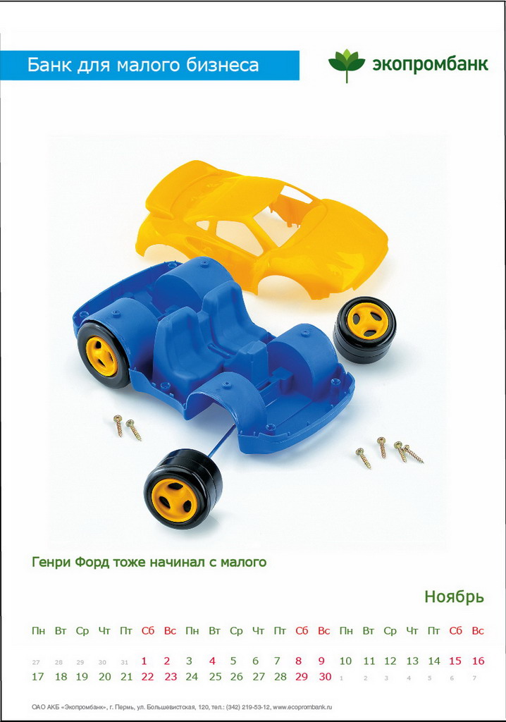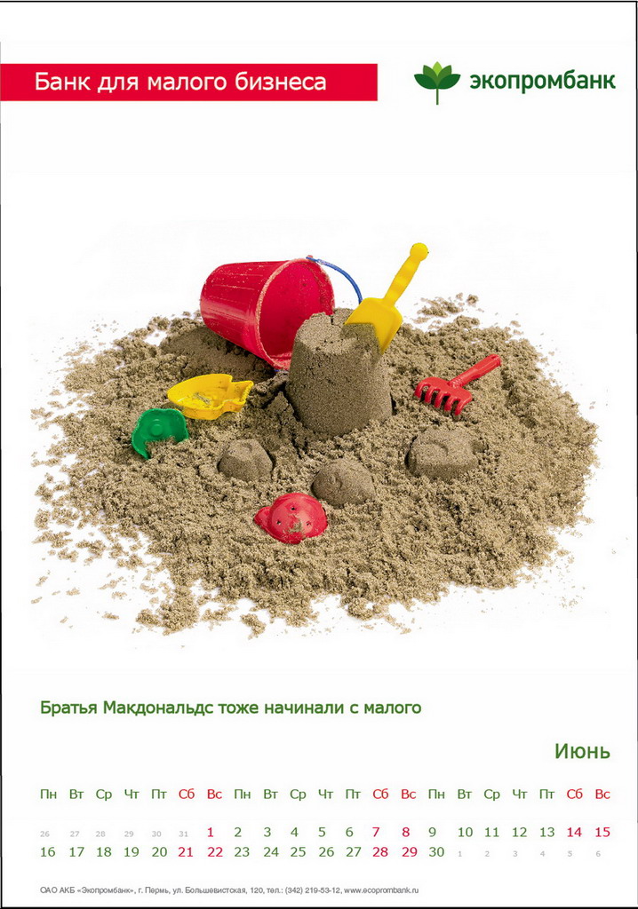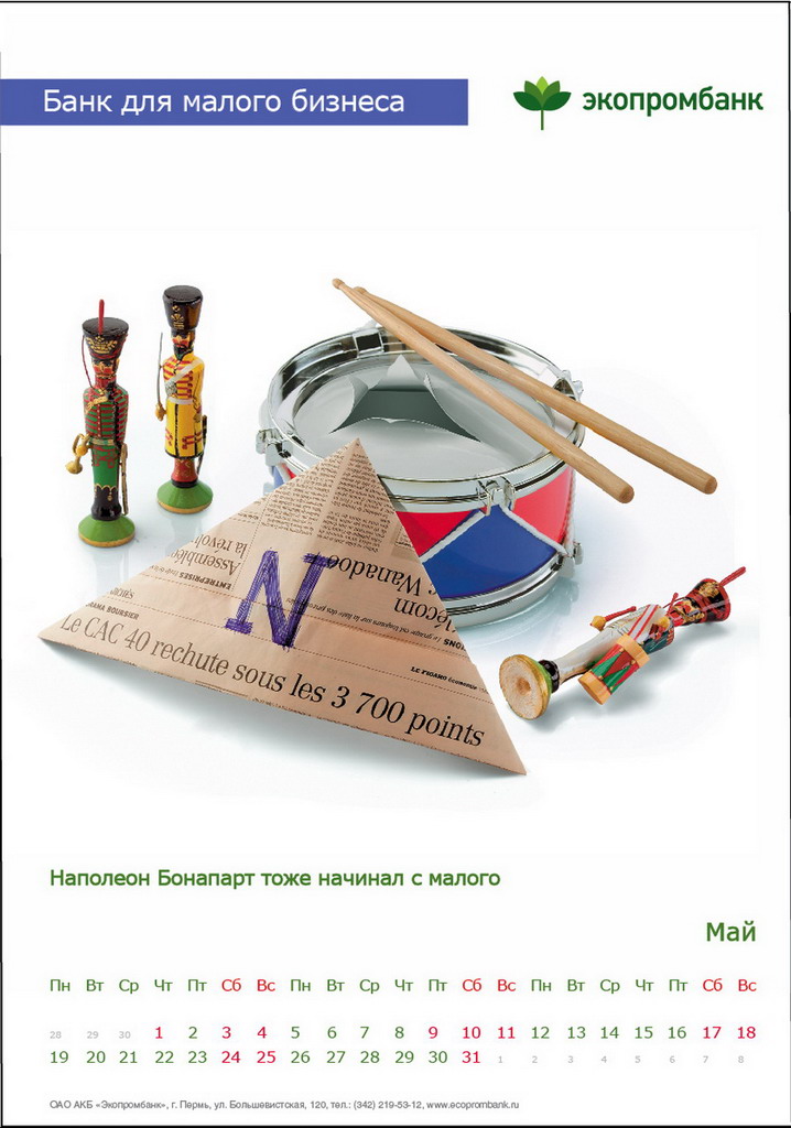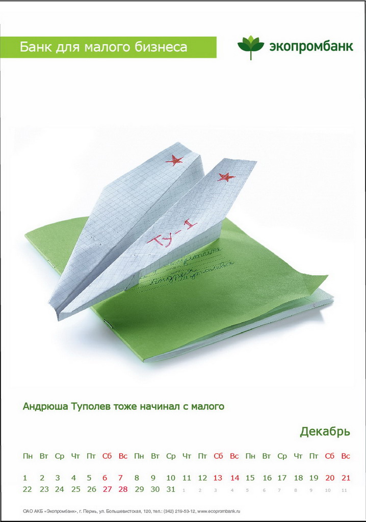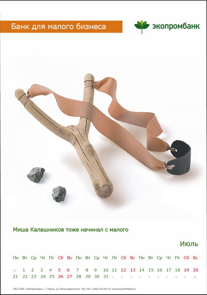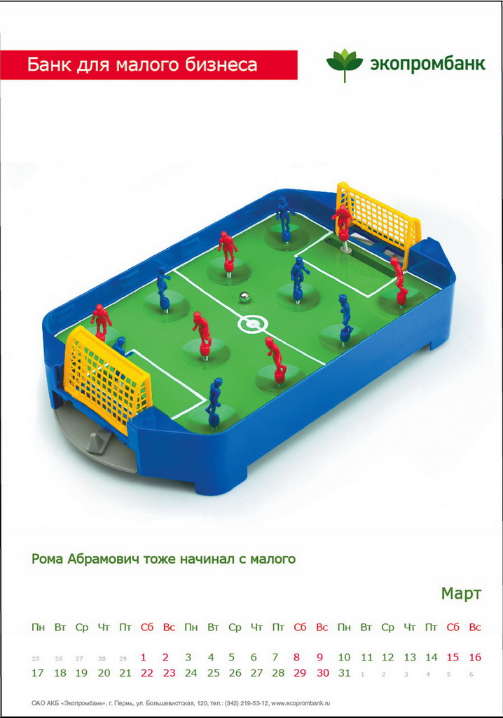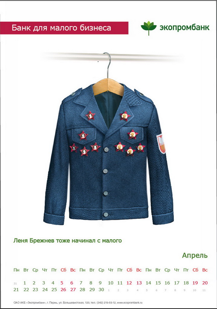 РГ "Мелехов и Филюрин": что общего между Леней Брежневым и "Макдональдсом"?Когда-то любой Большой Бизнес был маленьким: все с чего-то начинали. Для тех, чей бизнес пока еще мал, выпущен обнадеживающий календарь от "Экопромбанка".Состав творческой группы Идея календаря: Сергей Бирюков, Олег Гущин, Владимир Сергеев, Дмитрий Цветков Дизайн: Владимир Хананов, Павел Алексеев, Сергей Поздеев Фото: Дмитрий Петреев Арт-директор: Михаил Угожаев |