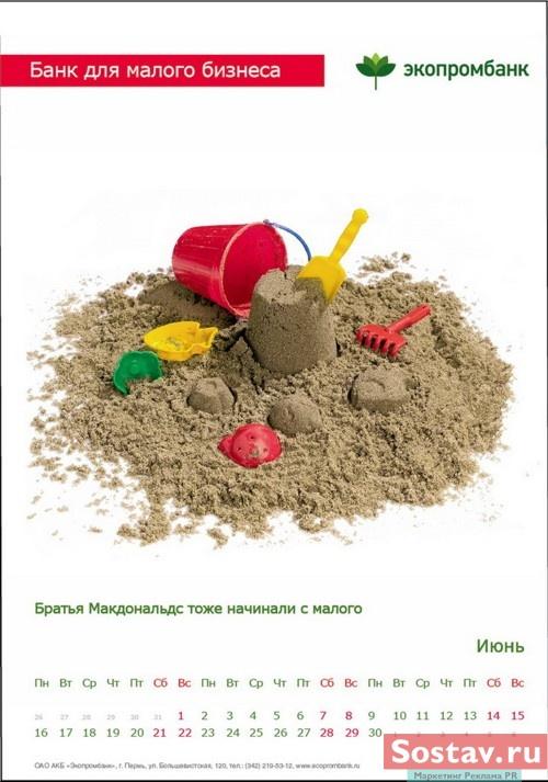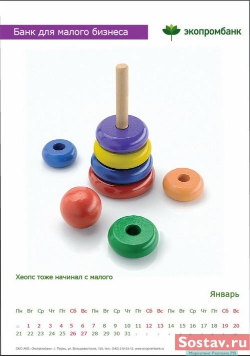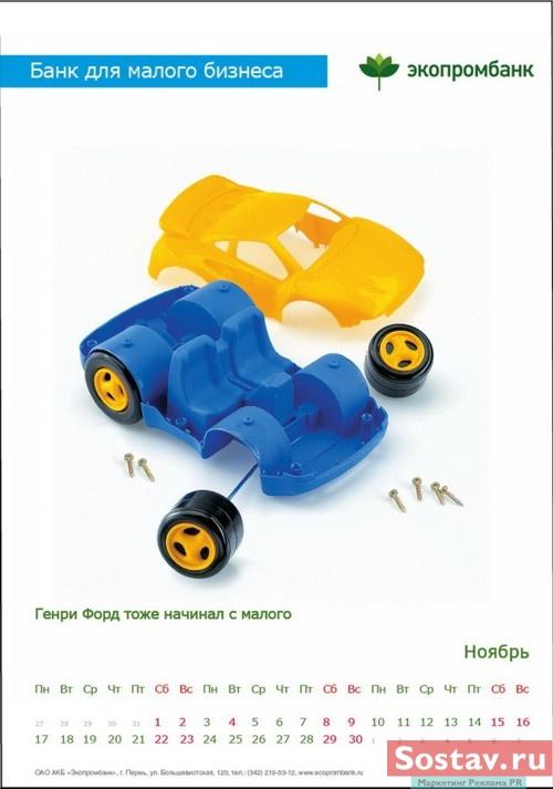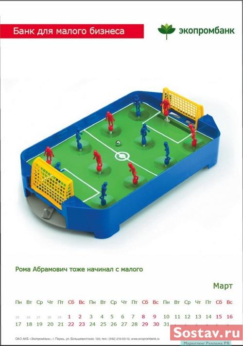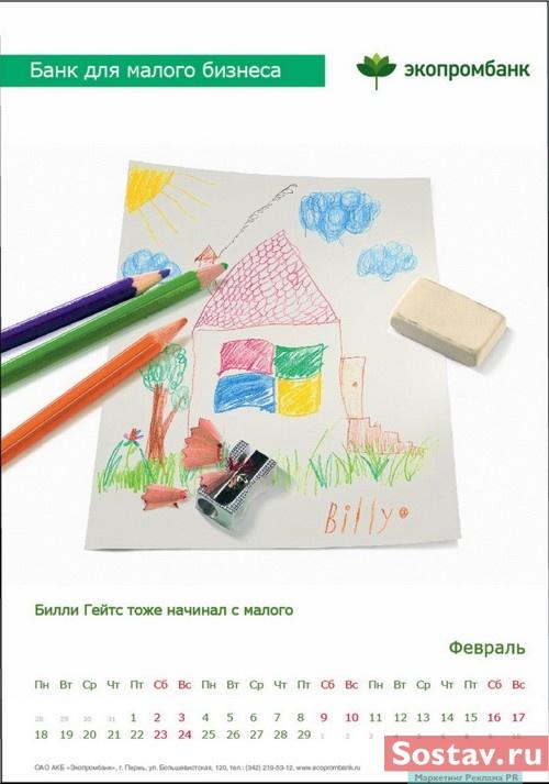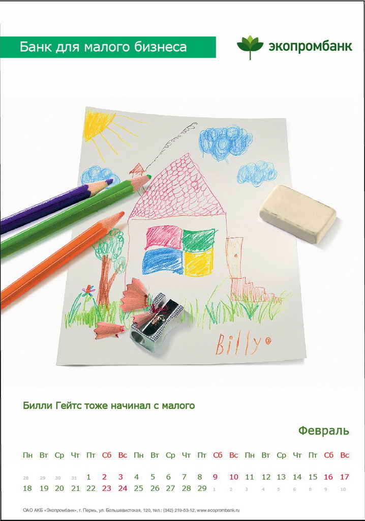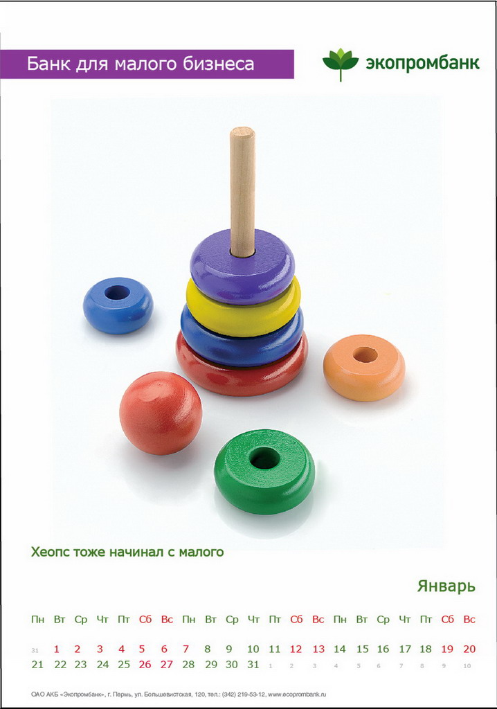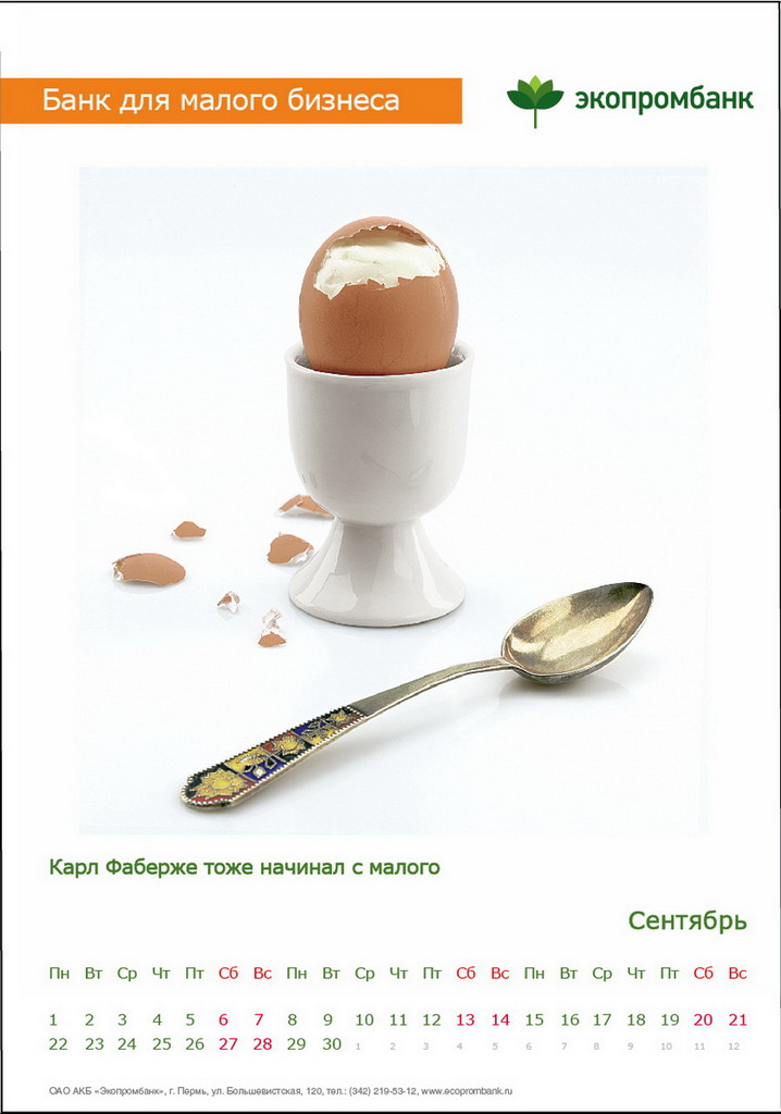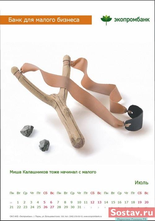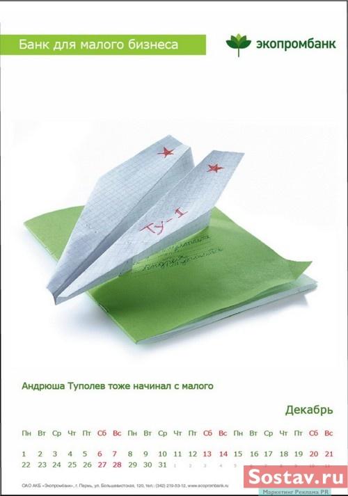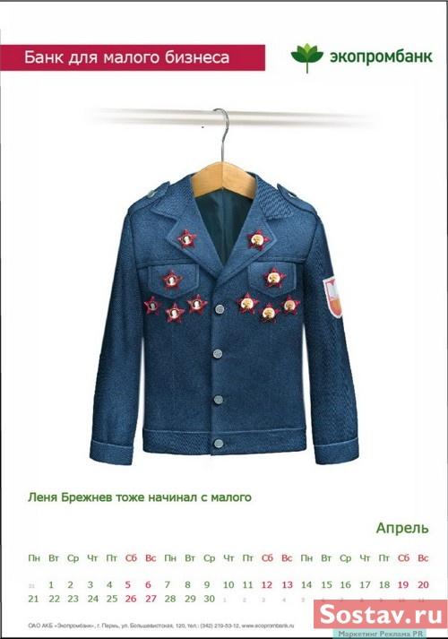 РГ "Мелехов и Филюрин": что общего между Леней Брежневым и "Макдональдсом"?Когда-то любой Большой Бизнес был маленьким: все с чего-то начинали. Для тех, чей бизнес пока еще мал, выпущен обнадеживающий календарь от "Экопромбанка".Состав творческой группы Идея календаря: Сергей Бирюков, Олег Гущин, Владимир Сергеев, Дмитрий Цветков Дизайн: Владимир Хананов, Павел Алексеев, Сергей Поздеев Фото: Дмитрий Петреев Арт-директор: Михаил Угожаев |