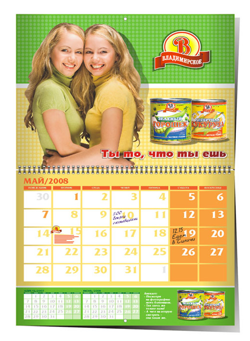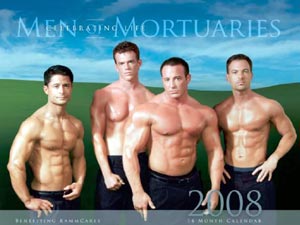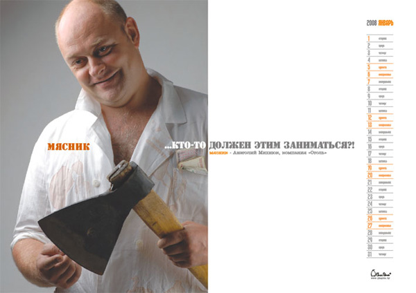 Кто-то должен этим заниматься?!" — гласит слоган. Героев сыграли руководители компаний — клиенты агентства. Все они вживались в образ перед объективом известного белорусского фотографа Ирены Гудзиевской. ![]() Мясника сыграл директор крупной строительной компании Анатолий Михнюк. ![]() На съемках тон задавала директор рекламного агентства "ПинГвин" Ольга Сороко. Она определила для себя роль уборщицы общественных туалетов. И снялась первая. ![]() В 2007 году на квартальном календаре компании, которая продает точечные светильники, были изображены женщина с фонарем в руке и субтильный мужчина с фингалом под глазом. Там же была подпись: "Обращайтесь к нам за фонарями". В 2008 году, судя по календарю и слогану "Наш свет найдет тебя везде", менеджмент "СанЭнерджи" планирует работать не менее эффективно. ![]() "Ты то, что ты ешь" — считает руководство продуктовой фирмы "Владимирское". Героев для фотосессии, лица которых похожи на продукты питания, авторы идеи искали среди знакомых. Заграничный опыт Тем временем в США вышел календарь "Мужчины в морге-2008", в котором снялись обнаженные работники похоронного бюро. Его выпустил руководитель такого бюро в штате Калифорния Кен Маккензи. Как сообщает AP, все доходы от продажи календаря, как и в 2007 году, пойдут на гранты женщинам, которым нужна помощь во время лечения рака. ![]() Сам Маккензи говорит, что календарь призван разрушить стереотипы насчет людей, которые занимаются похоронами. "Мы отнюдь не седые горбатые старики", — смеется он. Итальянские представители похоронных услуг не отстают от своих американских коллег. ![]() В календаре на следующий год руководство римского похоронного бюро, созданного в 1965 году, разместило возле своих гробов полуобнаженных девушек. Модели обнимают деревянные саркофаги, лежат на них, и, судя по выражениям их лиц, мечтают о таких же. Салідарнасць