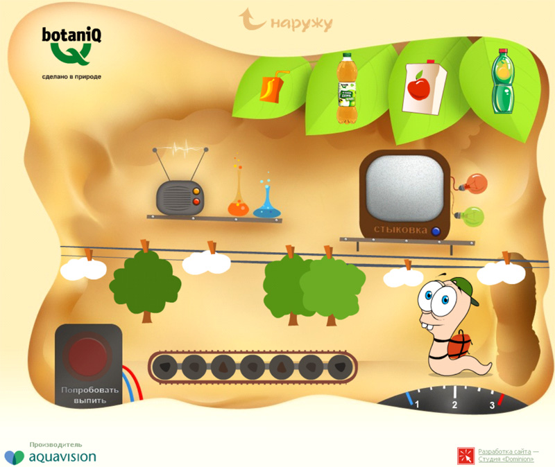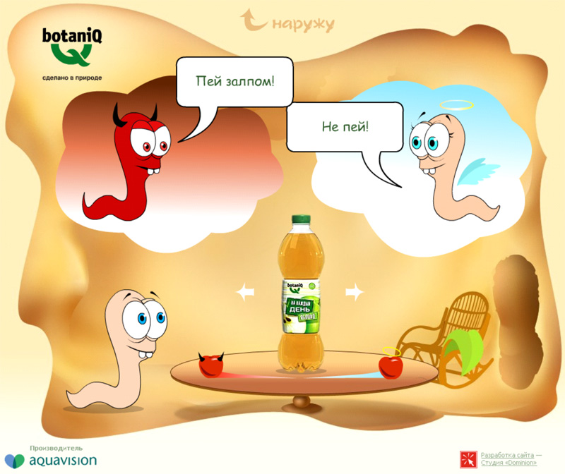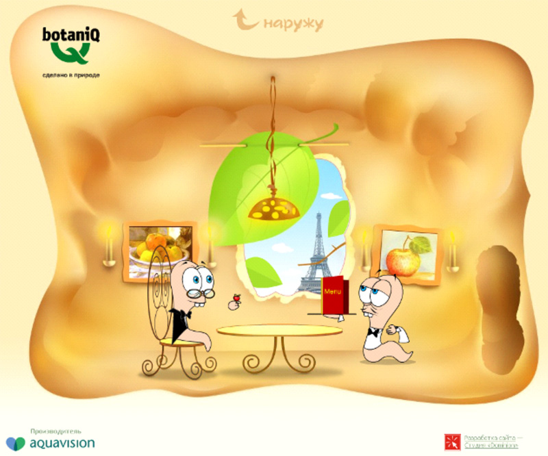 "Известно, что аудитория не склонна доверять прямым сообщениям о натуральности и природности, - отмечает старший бренд-менеджер "АКВА ВИЖИОН" Елена Савватеева. - Потребитель устал от клише "хорошее качество по доступной цене" и закрыт для такого рода сообщений. Креативное решение с яблочным червяком, рассчитано на то, что потребитель самостоятельно построит логическую цепочку и сделает вывод, что botaniQ сделан из натуральных фруктов, так как яблочные червяки во внешне красивых и глянцевых яблоках, продающихся в супермаркетах, как правило, не живут. Самые дорогие и натуральные органические продукты, выращенные без химических удобрений, весьма непрезентабельны на вид. Животные в природе, в отличие от человека, не утратили инстинкт выбора натурального, настоящего". Клики со всех баннеров как классической, так и "экспертной" концепций ведут на www.botaniQ.ru. На сайте в каждой комнатке яблока, которую прогрыз Че, в виде игры проходит эксперимент с botaniQ, в котором непосредственно участвуют пользователи. В каждой комнатке исследуется его определенное свойство. Как считают в "АКВА ВИЖИОН", людям нравятся серии и они хотят иметь возможность увидеть любую из них. Именно поэтому на сайте можно посмотреть любой из 12 баннеров обеих концепций. Делая клик на любом баннере botaniQ, человек, как полагают в компании, не ищет ничего конкретного, ему просто любопытно. "Поэтому на самом сайте через игру с максимальным вовлечением пользователя мы постарались донести основные преимущества botaniQ., - комментирует Дмитрий Гагушин. - Реклама в Интернете специфична. Сам Интернет и его аудитория позволяют использовать более смелые и до определенной степени провокационные креативные решения. В традиционных, не узко таргетированных СМИ, подобные решения малоприменимы, так как они могут сильно поляризовывать потребителей, ограничивая аудиторию. Впрочем, само название botaniQ в России - это разумная смелость, не позволяющая равнодушно реагировать на бренд". Сайт botaniQ.ru сделан в трех дизайнах: - до запуска кампании, когда Че, не покладая зубов, работал по прогрызке; - основной дизайн после запуска, с раскрывающимся яблоком; - текущий праздничный новогодний дизайн. Медиа-планированием и размещением кампании занимается агентство Carat. Состав творческой группы: "АКВА ВИЖИОН": Светлана Кувшинова Елена Савватеева Дмитрий Гагушин Игорь Бургардт Студия "Dominion" (кампания с яблочным червяком Че, создание сайта www.botaniQ.ru) Антон Быстрюков - дизайнер Александра Матвеева - дизайнер Михаил Востриков - flash-анимация, программирование Слава Ахмадуллин - арт-директор Александр Кушпель - директор/координатор проекта Креативное бюро Sahar (кампания с классическим креативом): Александр Родионов - креативный директор/копирайтер Алина Байрамова - арт-директор Студия 7 (производство кампании с классическим креативом): Дмитрий Федоренко - директор/координатор проекта Павел Блажиевский - аниматор Юрий Нагорный - арт-директор