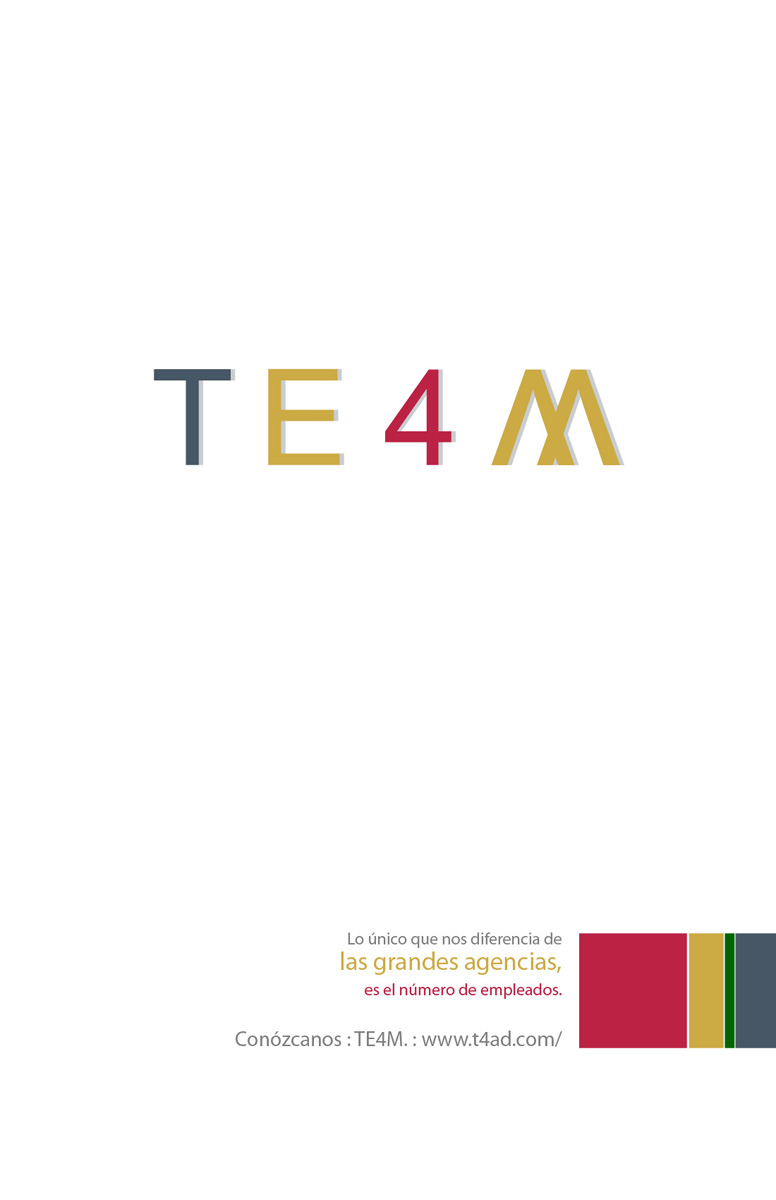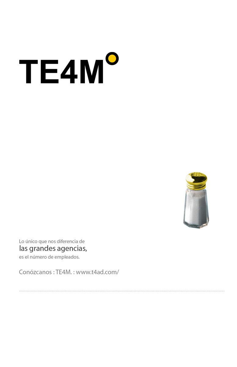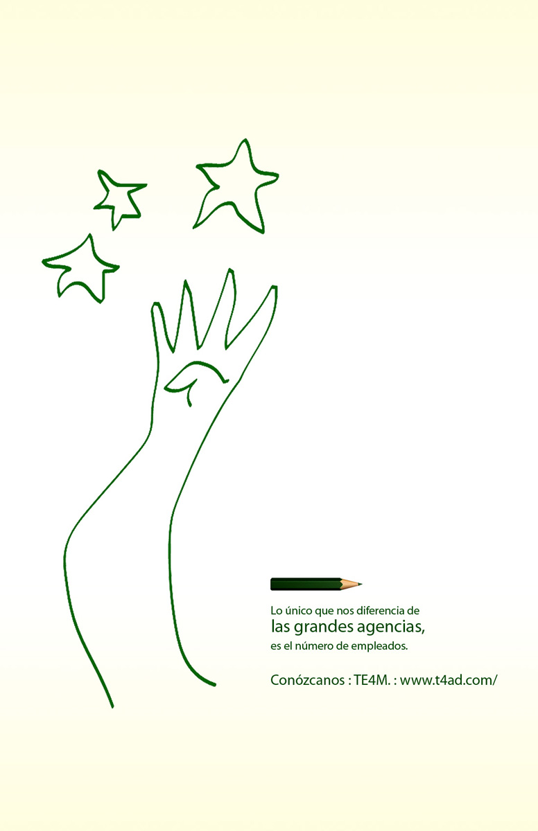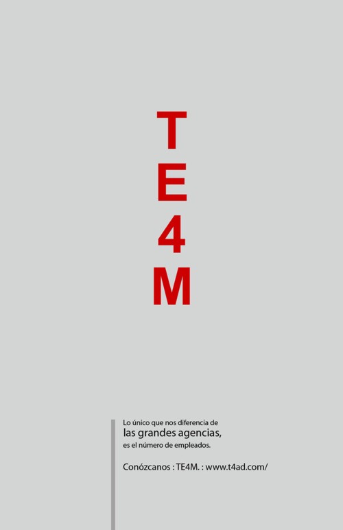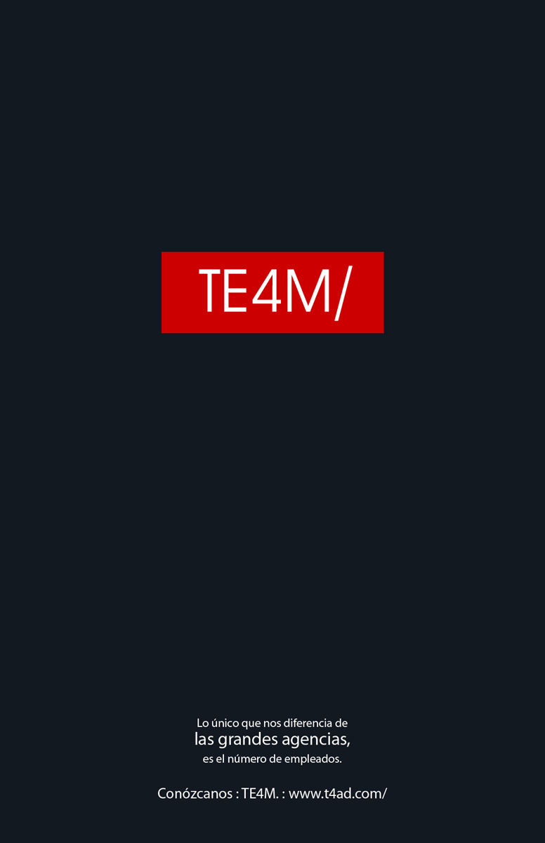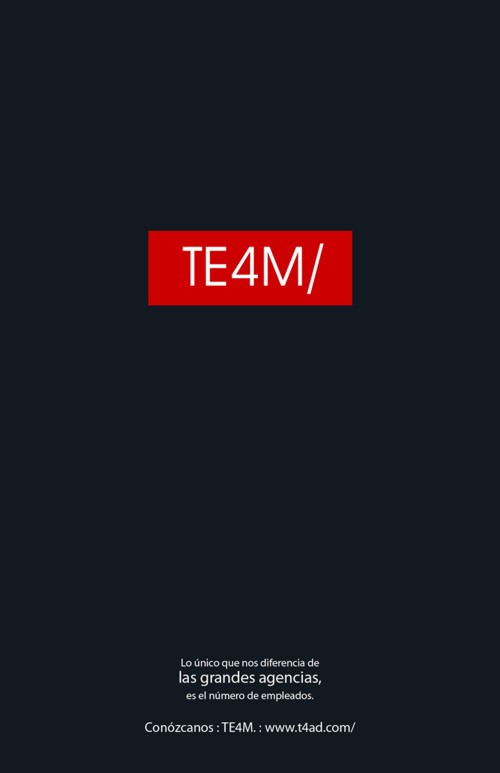 Чтобы доказать, что агентство TE4M не хуже других, оно использовало чужой фирменный стильЧтобы рассказать всему миру, что небольшое рекламное агентство TE4M ничем не хуже таких мировых гигантов, как BBDO, TBWA, Leo Burnett, JWT или DDB, сотрудники TE4M "украли" у этих агентств их фирменный стиль и переделали его под себя.Надпись: "Наше единственное отличие от больших агентств - это количество наших сотрудников." Агентство: TE4M, Богота, Колумбия Главный менеджер: Alejandro Zapata Творческий директор: Alexander Pineda, Carlos Eduardo Romero Медиа директор: Joaquin Perez |