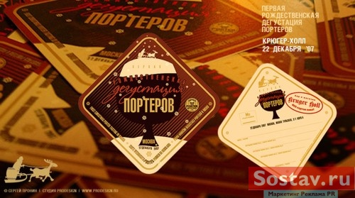 Сергей Пронин и студия ProDesign разработали знак и дизайн бирдекеля для Первой рождественской дегустации портеров, а также принял в ней участие своим портером - "Черный волк"Дегустация прошла 22 декабря 2007 года в Крюгер Холле, баре и магазине с самым крупным в Москве ассортиментом пива (более 400 сортов). К мероприятию было представлено 24 портера из Англии, Германии, Чехии, Италии и стран СНГ. В числе участников такие марки, как Нойцеле портер, Пардубицкий портер, Лондон портер от Фулерс, Мюнхель из С-Петербурга, Тверской Джон Батлер, Медовый портер от Сент-Петерс, Минтайм кофе портер и многие прочие. Среди образцов были и очень "специфичные" портеры - итальянские Ke To Re Porter и Re Proter.Пробы проводились 6-ю дегустаторами "вслепую", когда марка оцениваемого пива не могла быть опознана до пития. Руководил событием один из самых известных российских "пивоведов" - Павел Егоров. По результатам подсчета баллов "Черный волк" занял 4-е место, уступив немецкому Нойцеле и двум тверским портерам (Афанасию и Джону Батлеру). Тройку последних составили: Joulu Porter (Тарту, Эстония), BergG Porter (Речица пиво, Белоруссия) и Tinkoff Porter (Сан Инбев, Россия) ![]() |