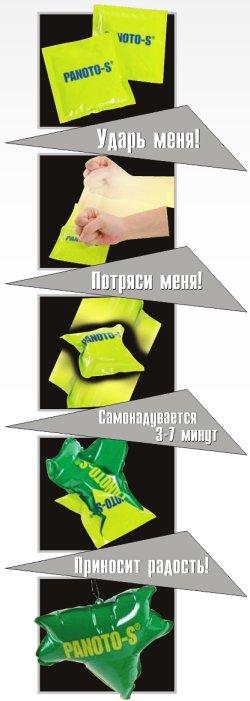 Как рассказала AdLife.spb.ru Зоя Заплаткина, директор агентства, сувенир представляет собой яркую надувную фигурку, которая при легком ударе надувается сама. «Такие игрушки с рекламными целями у нас в городе еще никто не применяет. Попытки завести в Россию что-то подобное были, но только в качестве развлечения для детей», - пояснила она.