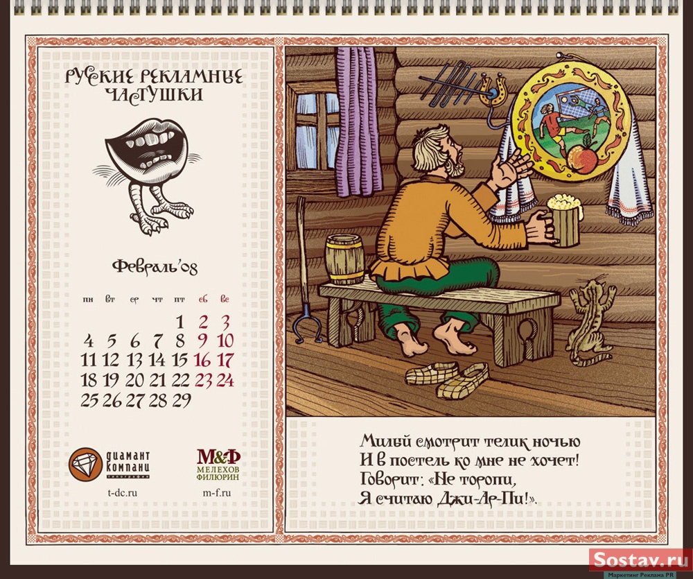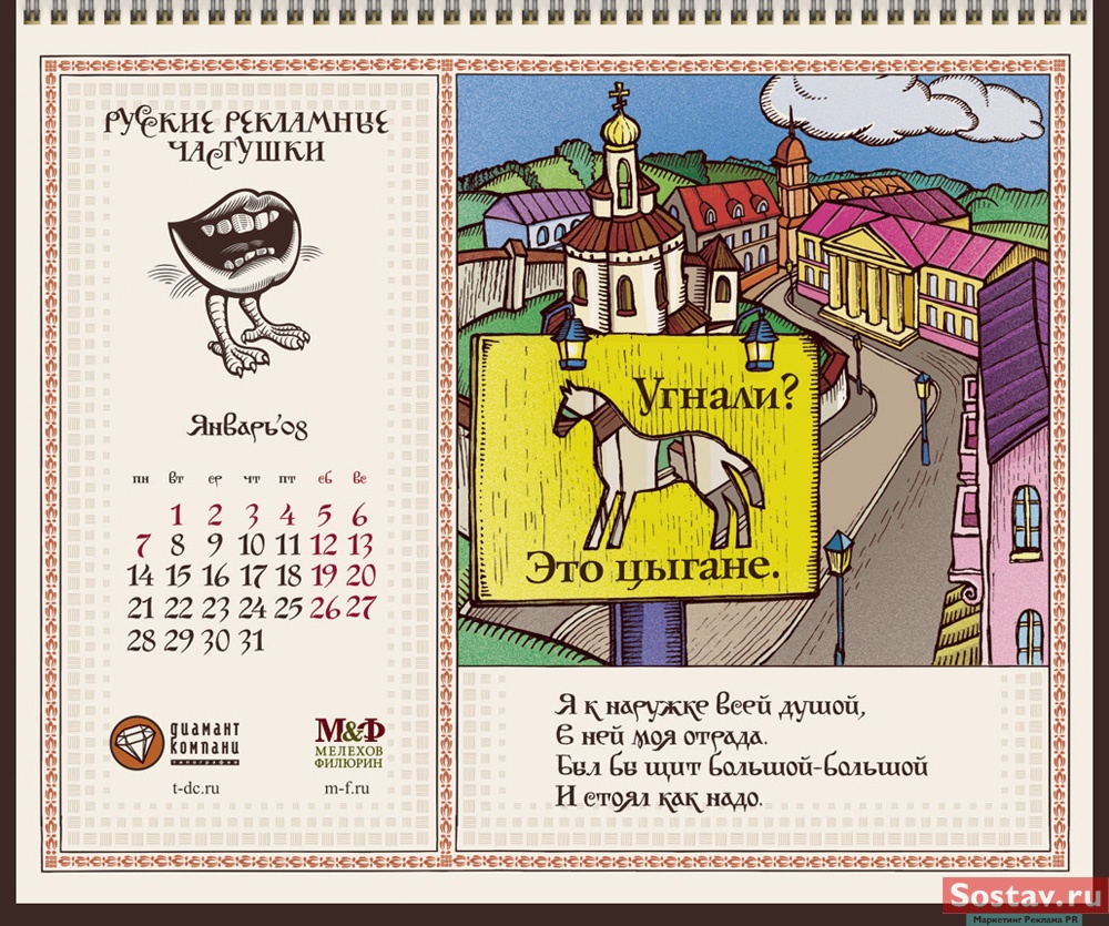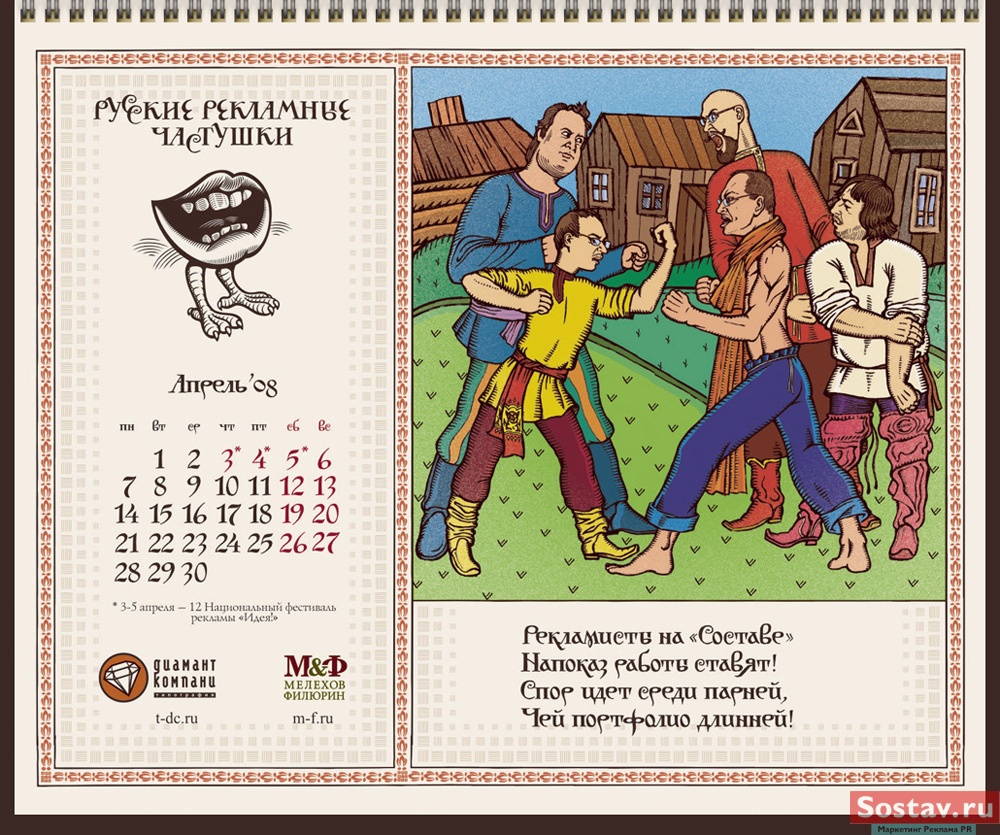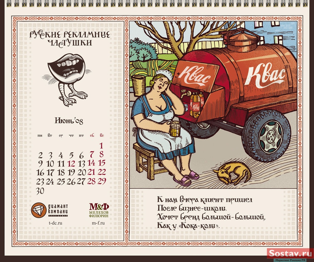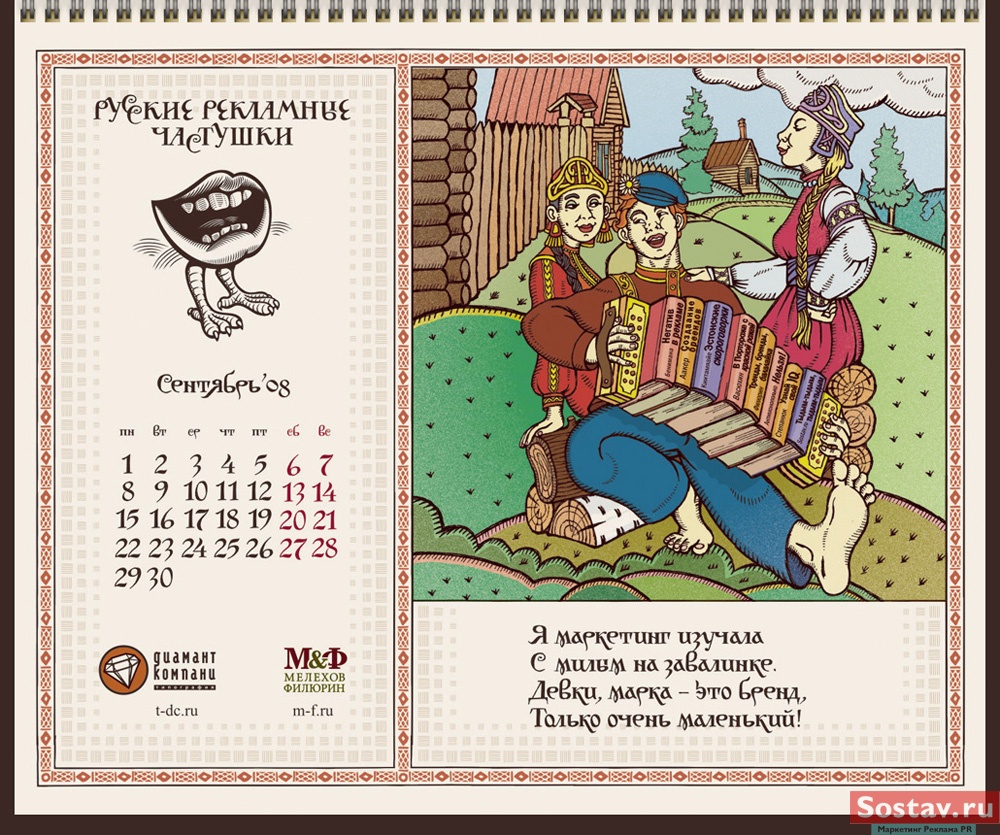 РГ "Мелехов и Филюрин": русские рекламные частушкиВ этом календаре мы решили рассказать народу о перипетиях рекламной жизни в простой и доступной форме - в форме частушки. На работу нас вдохновляло песенное творчество Бори Кондрашкова, кочегара котельной Техникума Легкой Промышленности, находящегося под окнами нашего офиса. А иллюстрации календаря - это стилизация под книжную графику начала 20 века.Все совпадения с конкретными людьми и торговыми марками либо случайны, либо сделаны исключительно ради рифмы. Частушки сочиняли: Сергей Бирюков, Олег Гущин, Владимир Сергеев, Дмитрий Цветков Частушки рисовали: Евгений Малков (иллюстрации), Елена Фризен (колорист), Михаил Угожаев (дизайн, логотип, шрифт) ![]() |