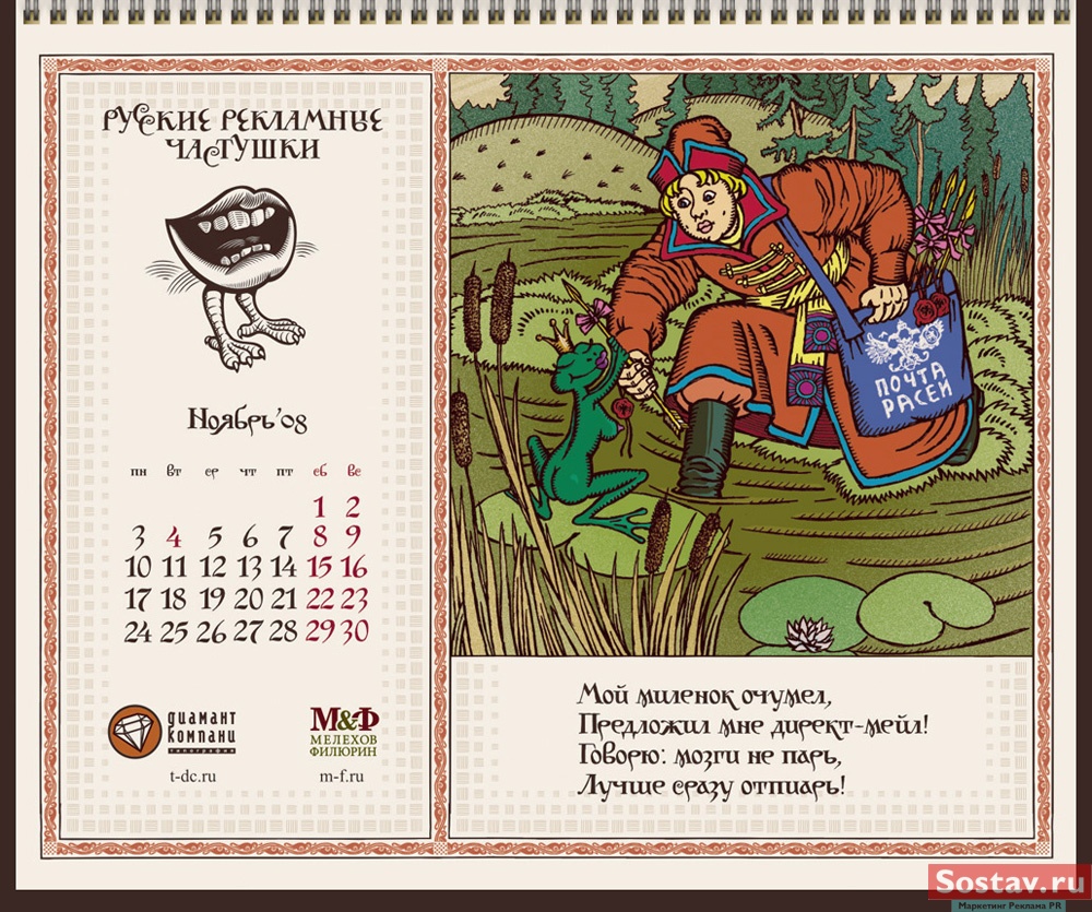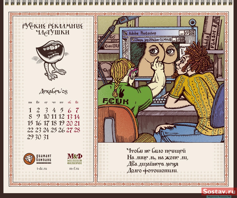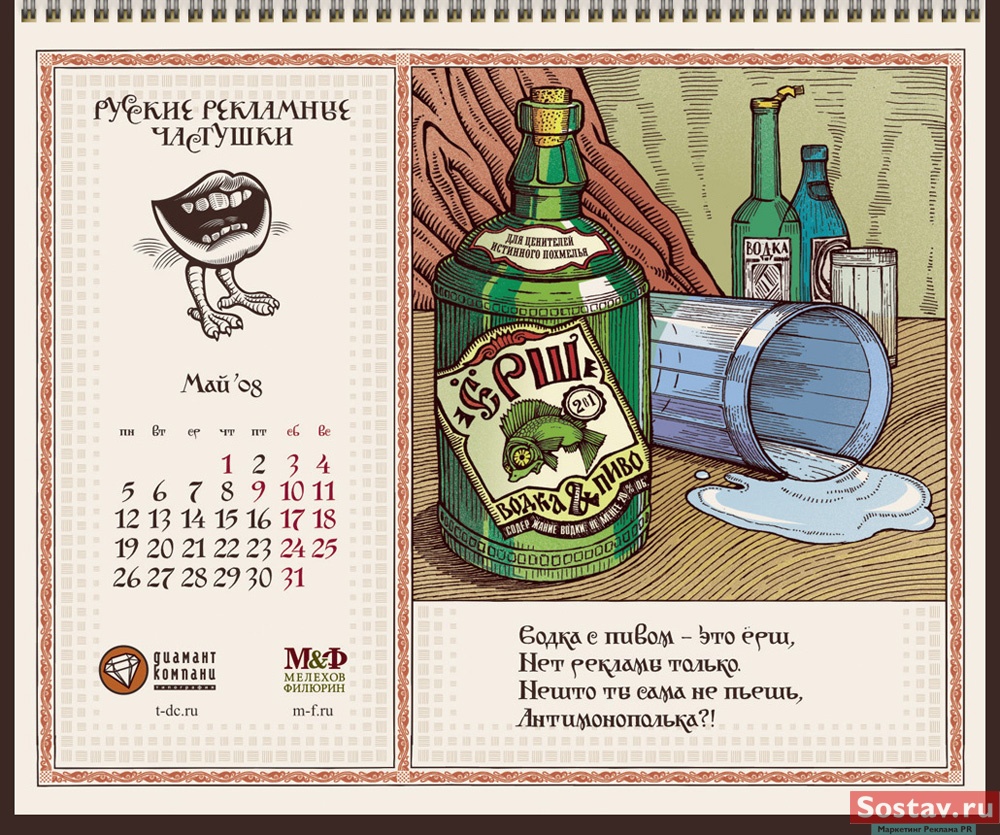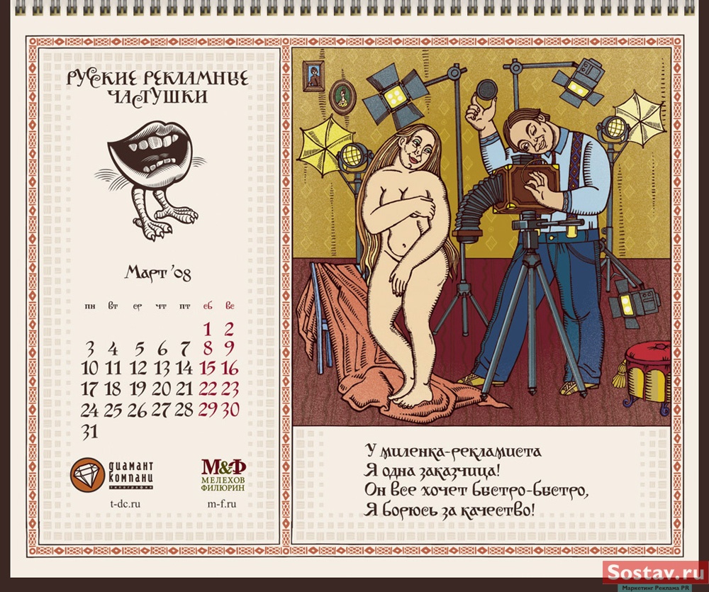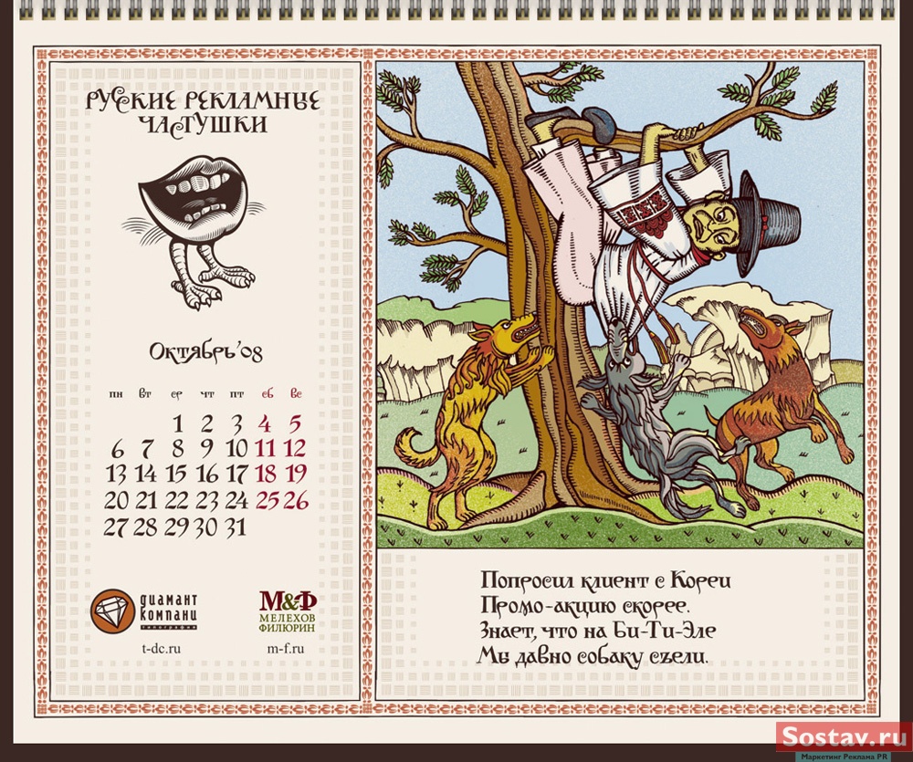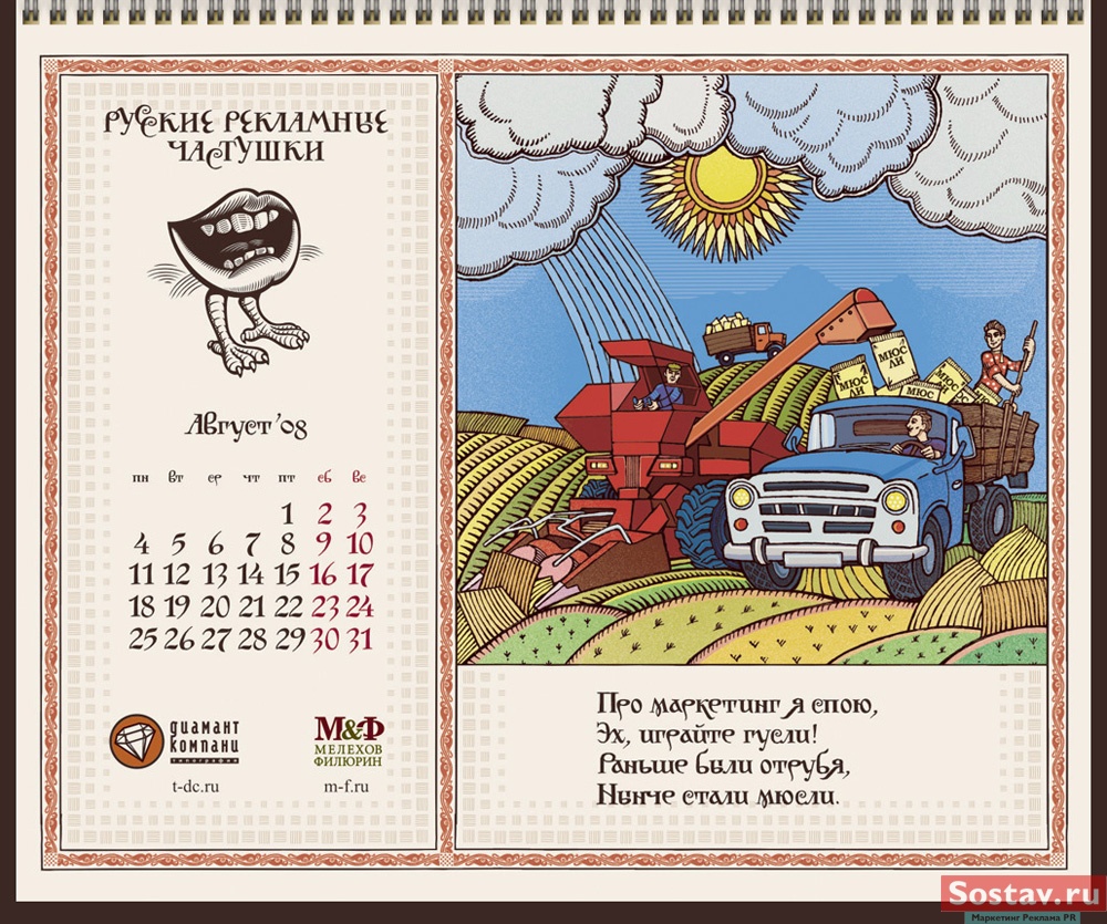 РГ "Мелехов и Филюрин": русские рекламные частушкиВ этом календаре мы решили рассказать народу о перипетиях рекламной жизни в простой и доступной форме - в форме частушки. На работу нас вдохновляло песенное творчество Бори Кондрашкова, кочегара котельной Техникума Легкой Промышленности, находящегося под окнами нашего офиса. А иллюстрации календаря - это стилизация под книжную графику начала 20 века.Все совпадения с конкретными людьми и торговыми марками либо случайны, либо сделаны исключительно ради рифмы. Частушки сочиняли: Сергей Бирюков, Олег Гущин, Владимир Сергеев, Дмитрий Цветков Частушки рисовали: Евгений Малков (иллюстрации), Елена Фризен (колорист), Михаил Угожаев (дизайн, логотип, шрифт) ![]() |