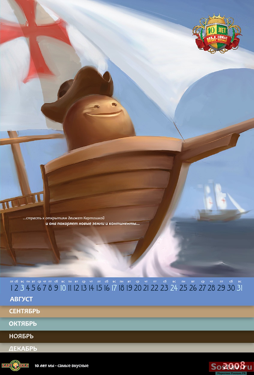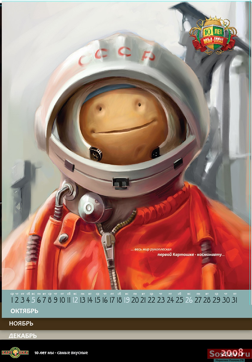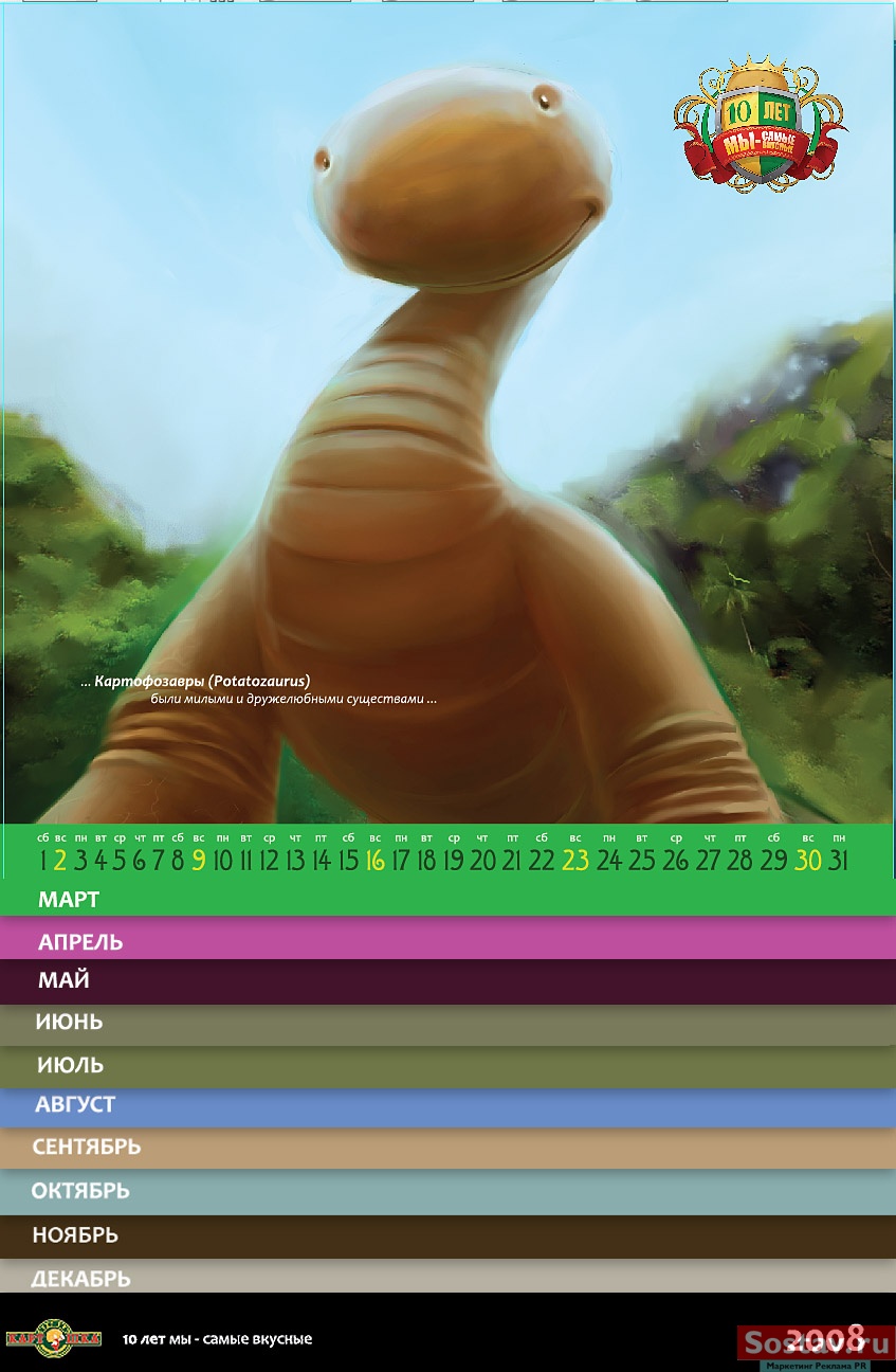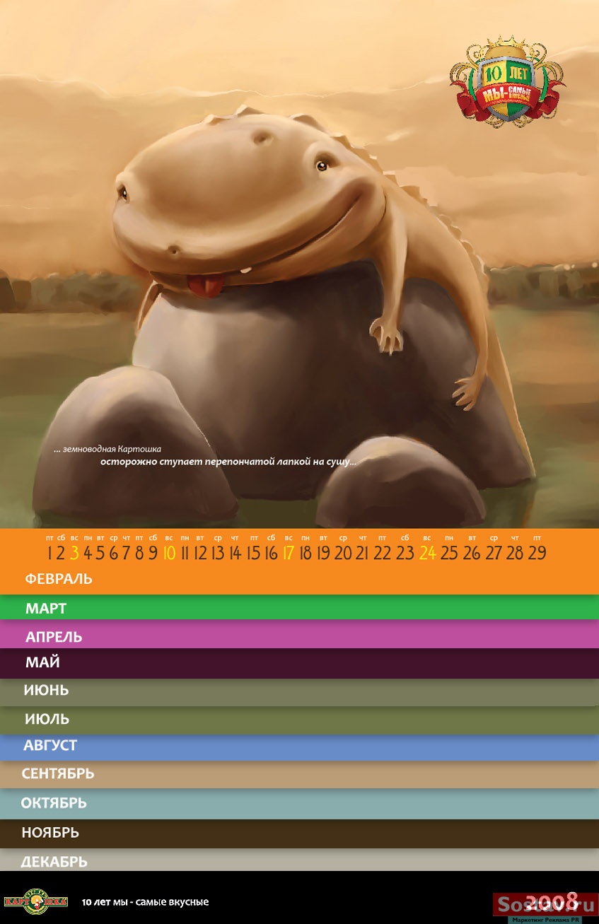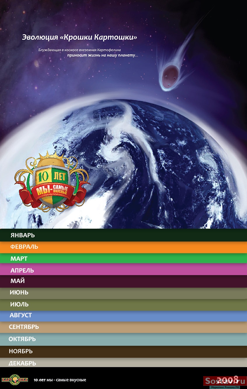 "Крошка-Картошка" эволюционировала за 10 летНаступающий 2008 год для компании "Крошка-Картошка" - юбилейный: в этом году компании исполняется 10 лет. К этой знаменательной дате "Крошка-Картошка" совместно со студией интернет-дизайна "Желтофиоль" создала новогодний иллюстрированный календарь под символичным названием "Эволюция "Крошки-Картошки" и новым лозунгом "Мы - самые вкусные".Визуализация данной концепции - процесс эволюции Картошки, которая предстает на страницах календаря в различных образах, последовательно описывающих все этапы эволюции. Так, на титульном листе календаря "Блуждающая в космосе внеземная Картофелина приносит жизнь на нашу планету": здесь изображен космос, сквозь который Картошка-метеорит бесстрашно и стремительно летит по направлению к Земле. Она врезается в нашу планету и порождает неизбежный процесс эволюции: это простейшие инфузории-Картофелинки и земноводная Картошка, Картофозавры и Картошка-мамонт, первобытная Картошка и Картошка в средние века. Страсть к открытиям движет Картошкой: она осваивает новые земли и континенты, изобретает автомобиль и покоряет космос. Но на этом Картошка не останавливается: она собирается завоевывать другие миры и инопланетные цивилизации. Таким образом, тематика календаря отражает основное направление деятельности компании, а подобная рекламная концепция демонстрирует процесс развития известного бренда на российском рынке. Значительный акцент делается на динамике роста и достижений, на эволюции бизнеса вцелом. Особенность данной концепции в ее метафоричности: она вербально и графически подтверждает то, что все начиналось с нуля, как было много ярких и запоминающихся ступеней, но тот, кто достиг определенных высот, не собирается останавливаться... Эволюция - процесс жестокий и необратимый: выживает сильнейший и для того чтобы не стать аутсайдером, нужно все время быть лучшим. |
