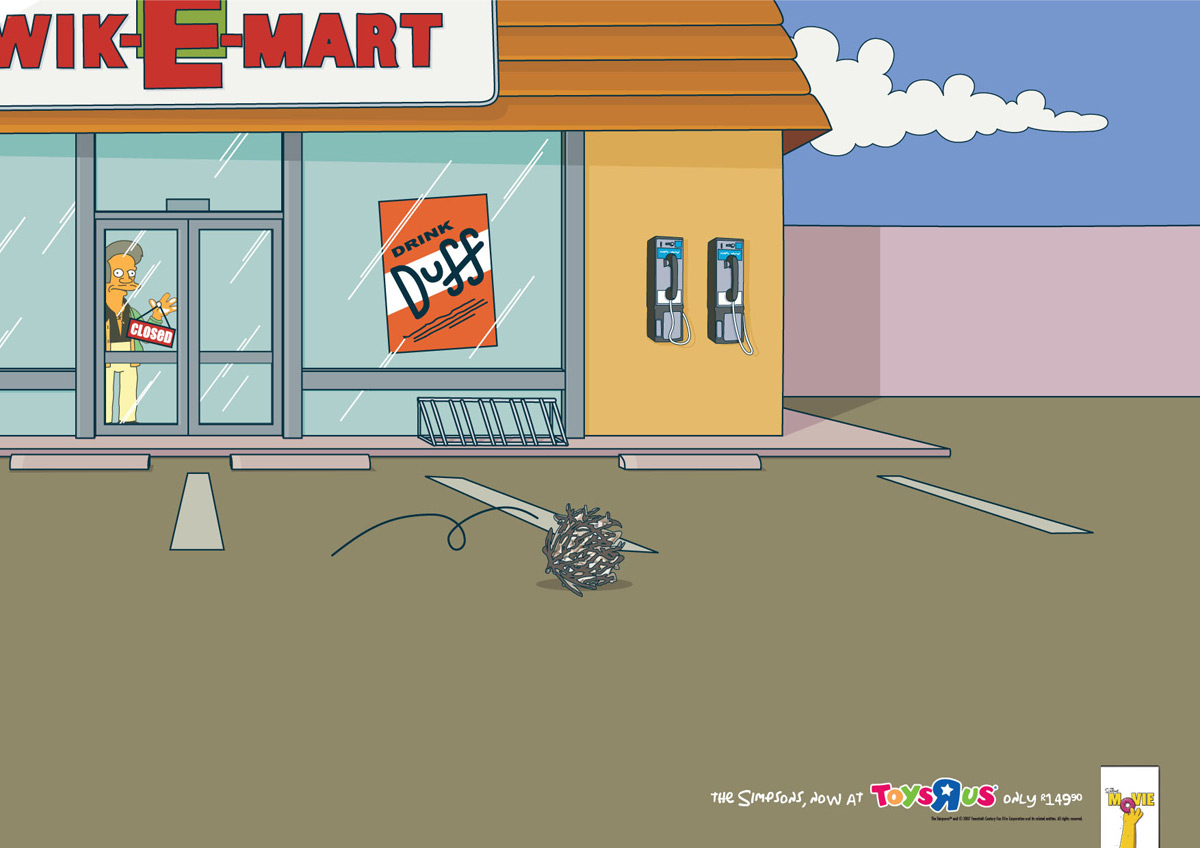 Магазин Toys R Us похитил СимпсоновЭти плакаты, созданные южноафриканским рекламным агентством Volcano, показывают нам картины опустевшего городка всемирно известной семьи Симпсонов. Дело в том, что большинство персонажей этого мультсериала теперь находятся в магазине игрушек Toys R Us.Надпись: "Симпсоны, теперь в Toys R Us. Всего за R149.90" Агентство: Volcano, Йоханнесбург, Южная Африка Творческий директор: Glenn Jeffrey Арт директор: Francois Boshoff, Glenn Jeffrey, Jade Manning Иллюстратор: Francois Boshoff, Jade Manning |