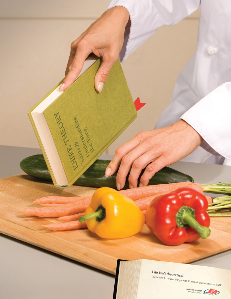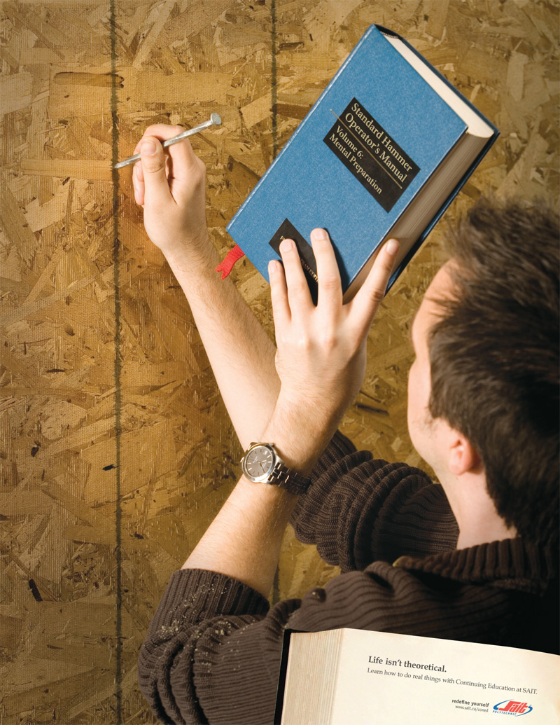 В политехникуме SAIT вас научат, как забить гвоздьС помощью теории не нарежешь овощи, не забьешь гвоздь и не сваришь деталь. Для этого нужны практические навыки, которыми можно обзавестись, как сообщает нам канадское агентство Creative Intelligence, только в политехническом учебном заведении SAIT Polytechnic.Надпись: "Жизнь - не теория. Узнайте, как делать реальные вещи с помощью Дальнейшего Образования в SAIT." Агентство: Creative Intelligence, Калгари, Канада Творческий директор: Christopher Heatherington Арт директор: Brian Allen Копирайтер: Sean Mitchell Фотограф: Gary Campbell |