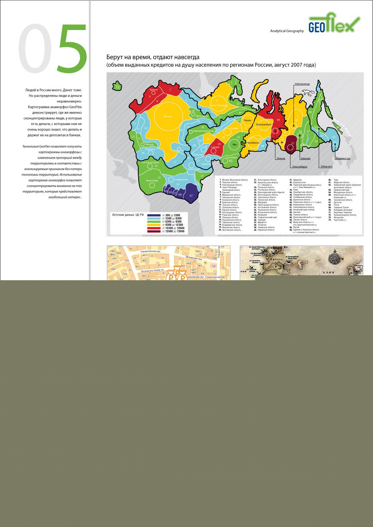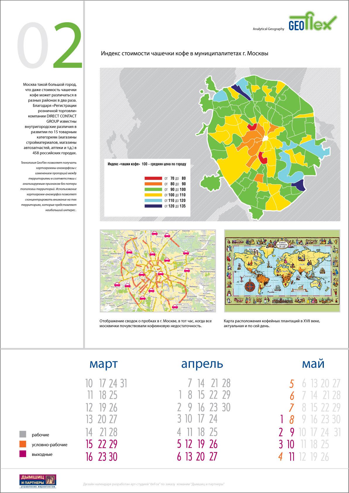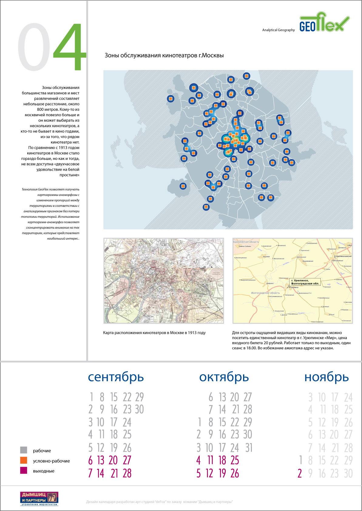 Компанией "Дымшиц и партнеры" был выпущен календарь на новый 2008 год, созданный с помощью анаморфического программного обеспечения "Geoflex"В календаре наглядно демонстрируются возможности и преимущества использования анаморфированных карт и ГИСа (географических информационных систем), а также некоторые недостатки привычных географических карт.Календарь состоит из пяти основных листов, на каждом из которых можно найти интересные факты, отображенные картографически. Нельзя оставить без внимания концептуально новый взгляд на классификацию дней. Помимо "рабочих" и "выходных", для большей точности и правдивости, были выделены также "условно-рабочие" дни.