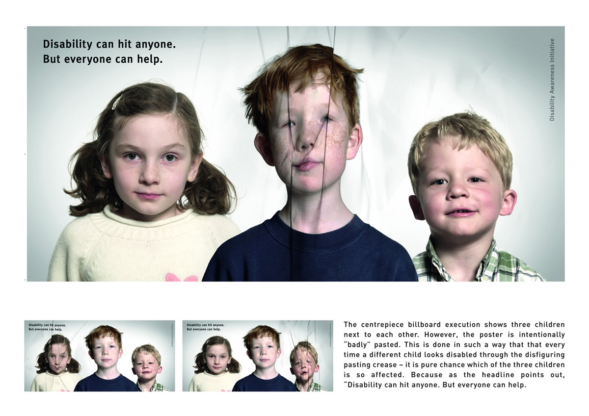 "Скомканные дети" от австрийского агентства Demner, Merlicek & BergmannДля того, чтобы показать, что человек, не способный к труду или имеющий инвалидность, выпадает из социума, агентство Demner, Merlicek & Bergmann Vienna поместило на биллборд изображение трех детей. Изображение одного из них искажено, вследствие чего он выпадает из общей картины.Надпись: "Инвалидность может коснуться кого угодно. Но все могут помочь" Состав творческой группы Рекламное агентство: Demner, Merlicek & Bergmann, Vienna, Austria Арт директор: Francesco Bestagno Фотограф: Stefan Badegruber Графика: Daniela Schabernak |