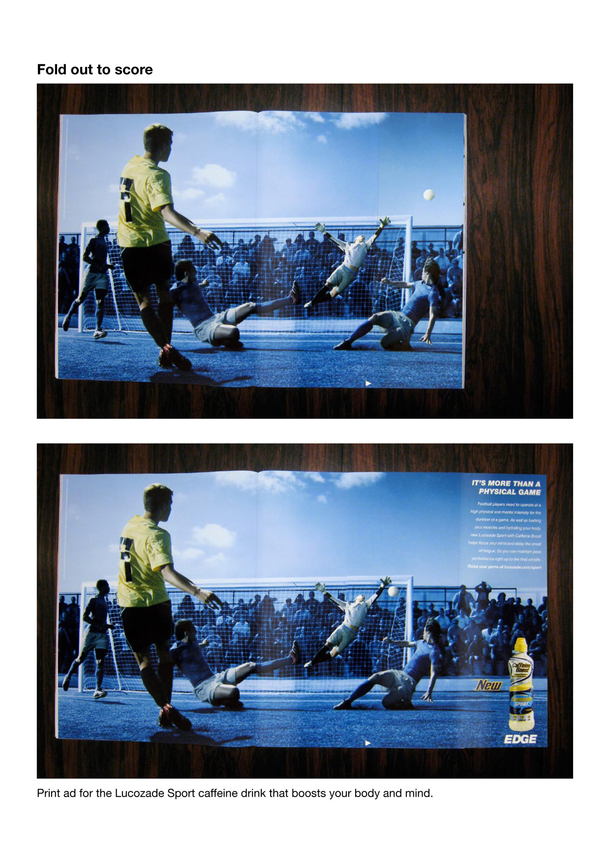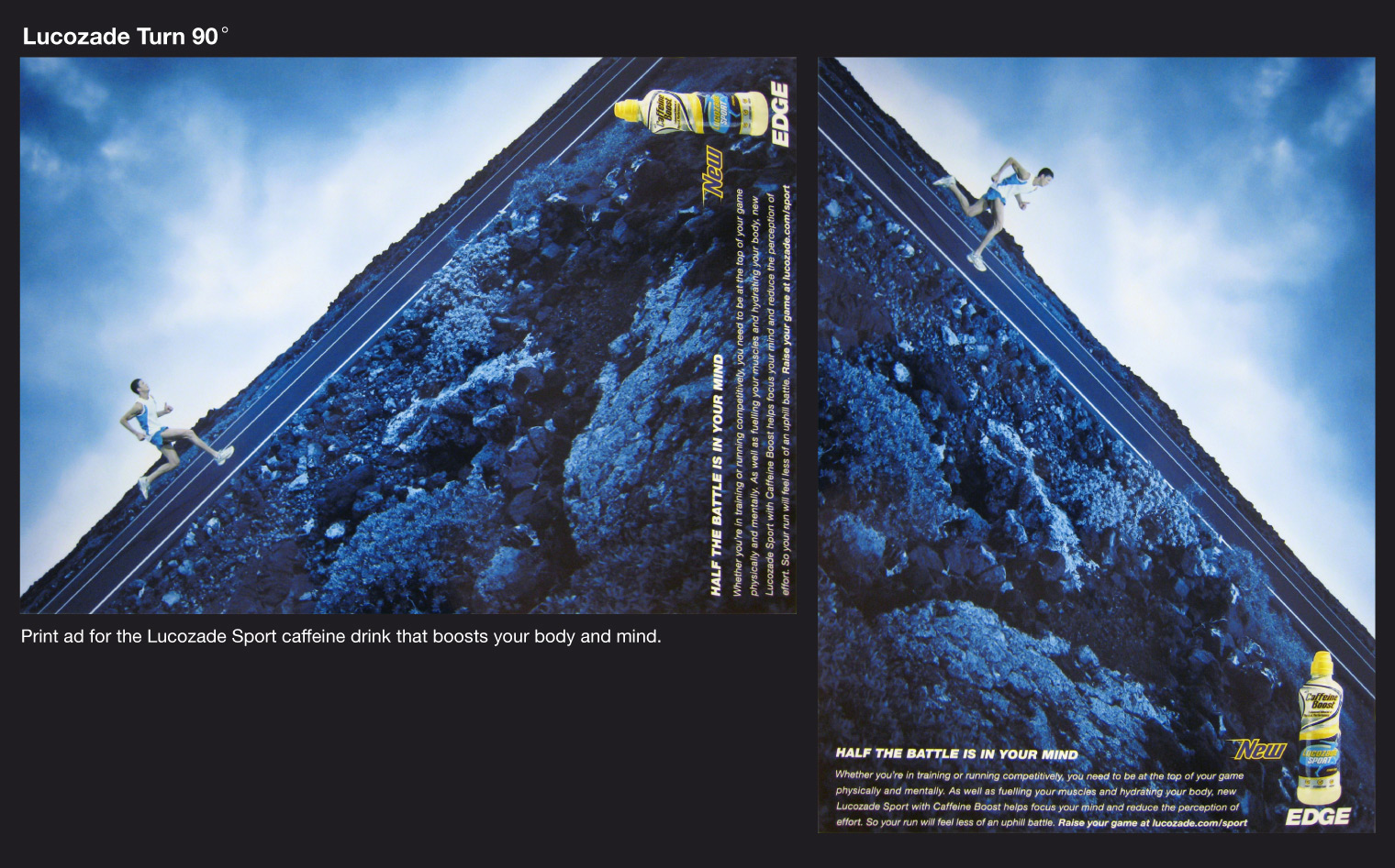 Энергетик Lucozade Sport помогает забивать голыLucozade Sport - это энергетический напиток с кофеином, который поддерживает ваше тело и разум, заявляет английское агентство M&C Saatchi. Этот напиток поможет не только легче взобраться в гору, но и забить красивый гол, сообщает нам эта рекламная кампания.Агентство: M&C Saatchi, Лондон, Соединенное Королевство Творческий директор: Graham Fink Творческая группа: Tobias Carlson, Jonas Wittenmark Фотограф: Klaus Thyman |