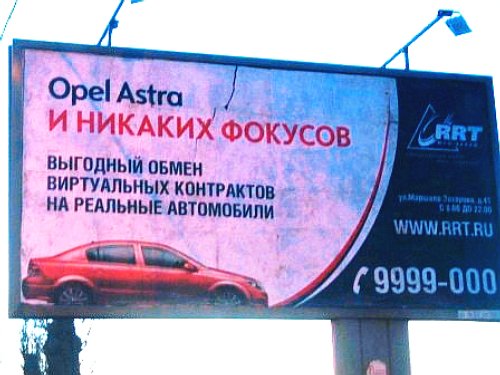 Один из петербургских дилеров General Motors — «РРТ Юго-Запад» разместил в Петербурге порядка 100 сторон щитов 3?6 со слоганом «Opel Astra — и никаких фокусов с контрактами». Фраза «и никаких фокусов» выделяется размером и красным цветом. Кампания, которая оценивается экспертами $150 000-200 000, продлится до конца февраля.