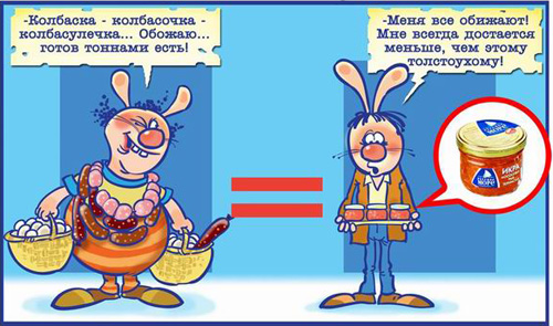 Отдельного внимания заслуживает видимо не новый, но от этого не менее замечательный комикс, опубликованный на сайте "Русского моря" (автор шедевра, к сожалению, не указан). Цель сего творения - разоблачить миф о том, что икра - "дорогостоящее кушанье для особых случаев". Мол, икоркой-то можно и так, за завтраком перекусить. Герои комикса - зайцы Митюха и Васюха (похож, да?). Почему именно зайцы и каким образом они должны навевать думы о красной икре - не объясняется. Итак, предыстория такова: Митюха завладел четырьмя батонами колбасы и шестью десятками яиц, а Васюха получил шесть банок икры.