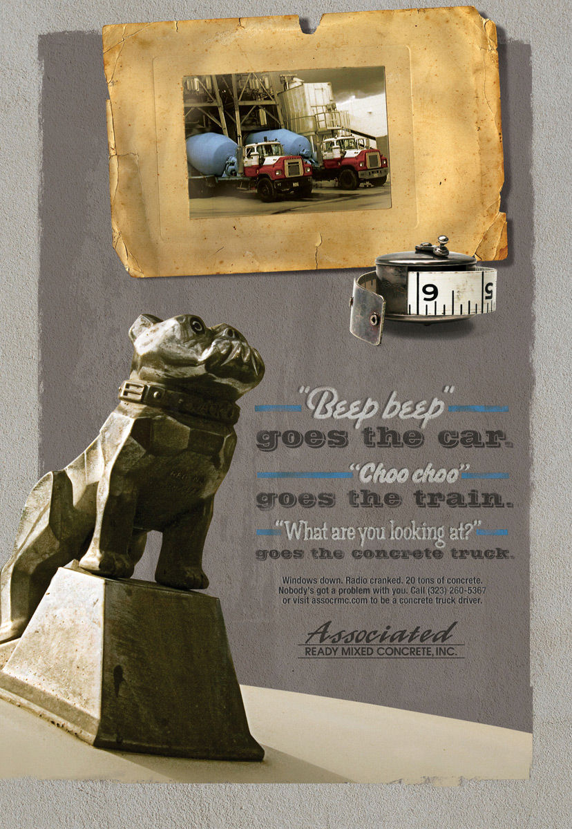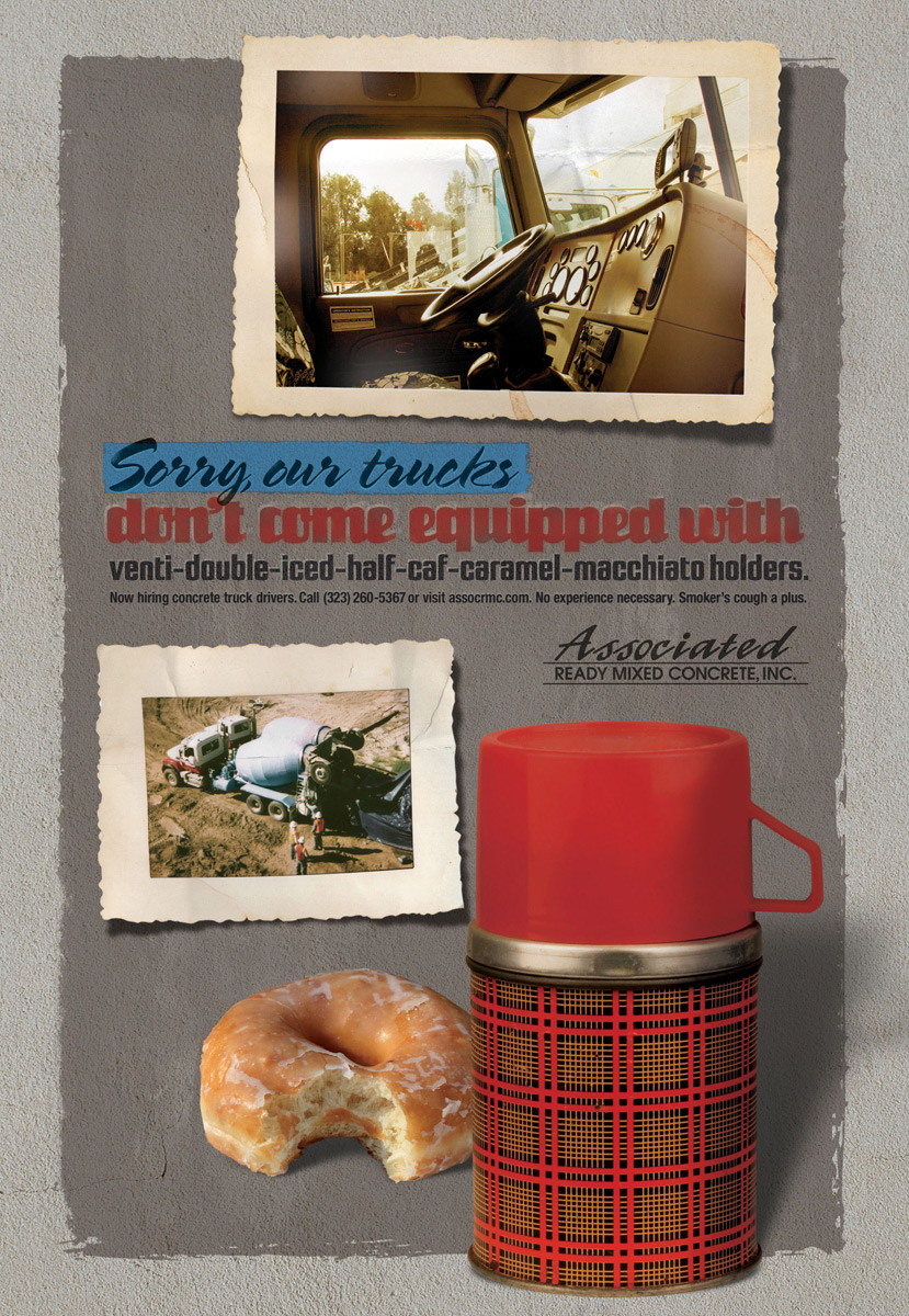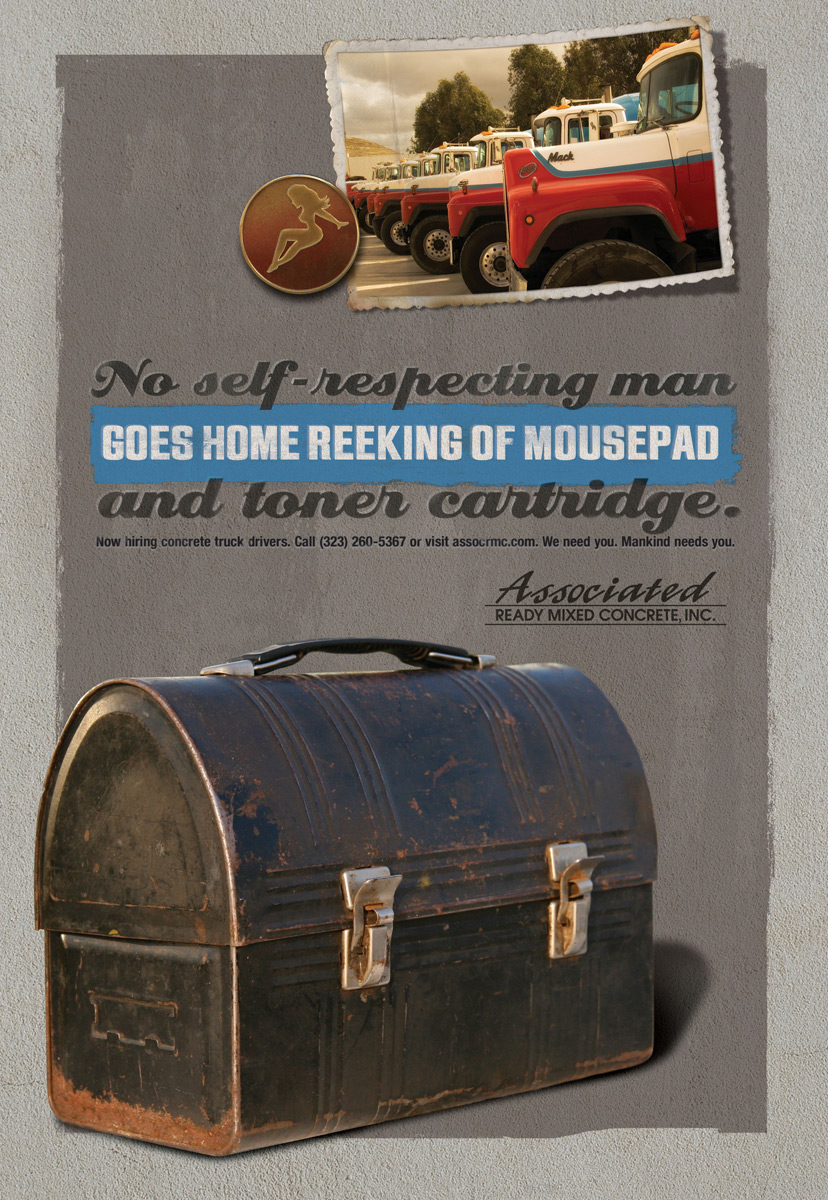 Настоящие мужчины работают на бетономешалкахПо мнению агентства O'Leary and Partners человечеству необходимы не офисные работника с пониженной самооценкой, а бравые мужчины, сидящие за рулем бетономешалки. Хоть грузовики и не оборудованы подставками под кофе и держателями для пончиков, но зато в них можно курить и за спиной у тебя будет 20 тонн бетона, кто посмеет тебя подрезать?Состав творческой группы Рекламное агентство: O'Leary and Partners, Newport Beach, USA Творческие директора: Eric Spiegler, Deirdre McQuaide Арт директор: Paul Christensen Копирайтер: Matt McNelis Фотографы: Paul Christensen, Andrea Caillier |