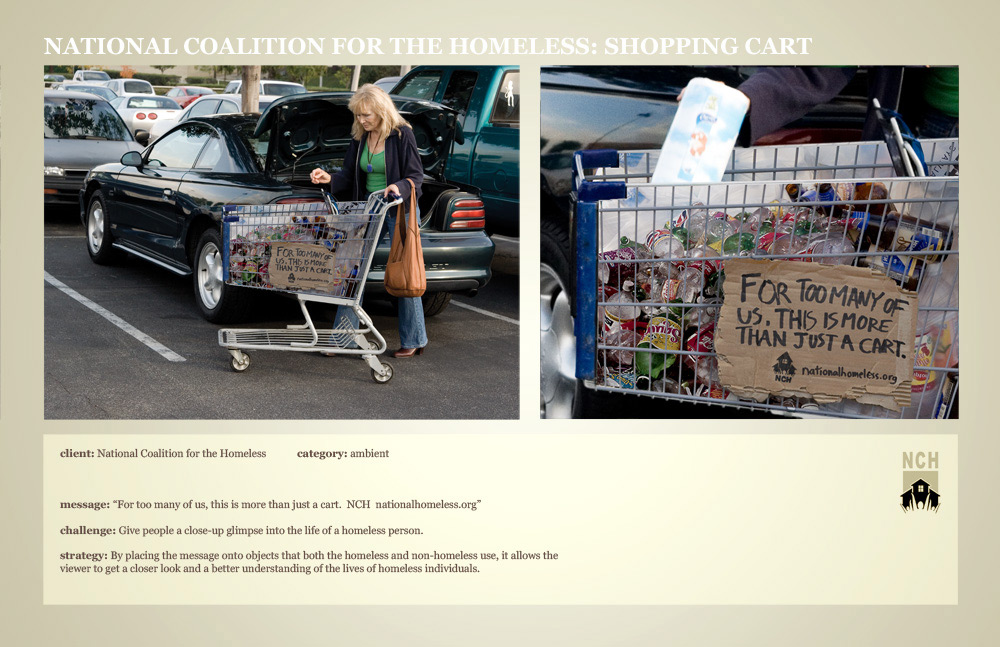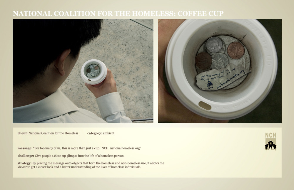 Газета - это одеяло и необычный стакан кофеДля привлечения внимания американского населения к проблеме бездомных людей, рекламная школа Art Center College of Design представила самые обычные и часто встречающиеся в повседневной жизни простого человека вещи несколько в ином свете. Так газета превратилась в одеяло, пластиковый стаканчик из-под кофе в стакан для сбора милостыни, а магазинная тележка в тележку для сбора бутылок.Состав творческой группы Рекламная школа: Art Center College of Design, Pasadena, California, USA Арт директор: Aaron Yuan |