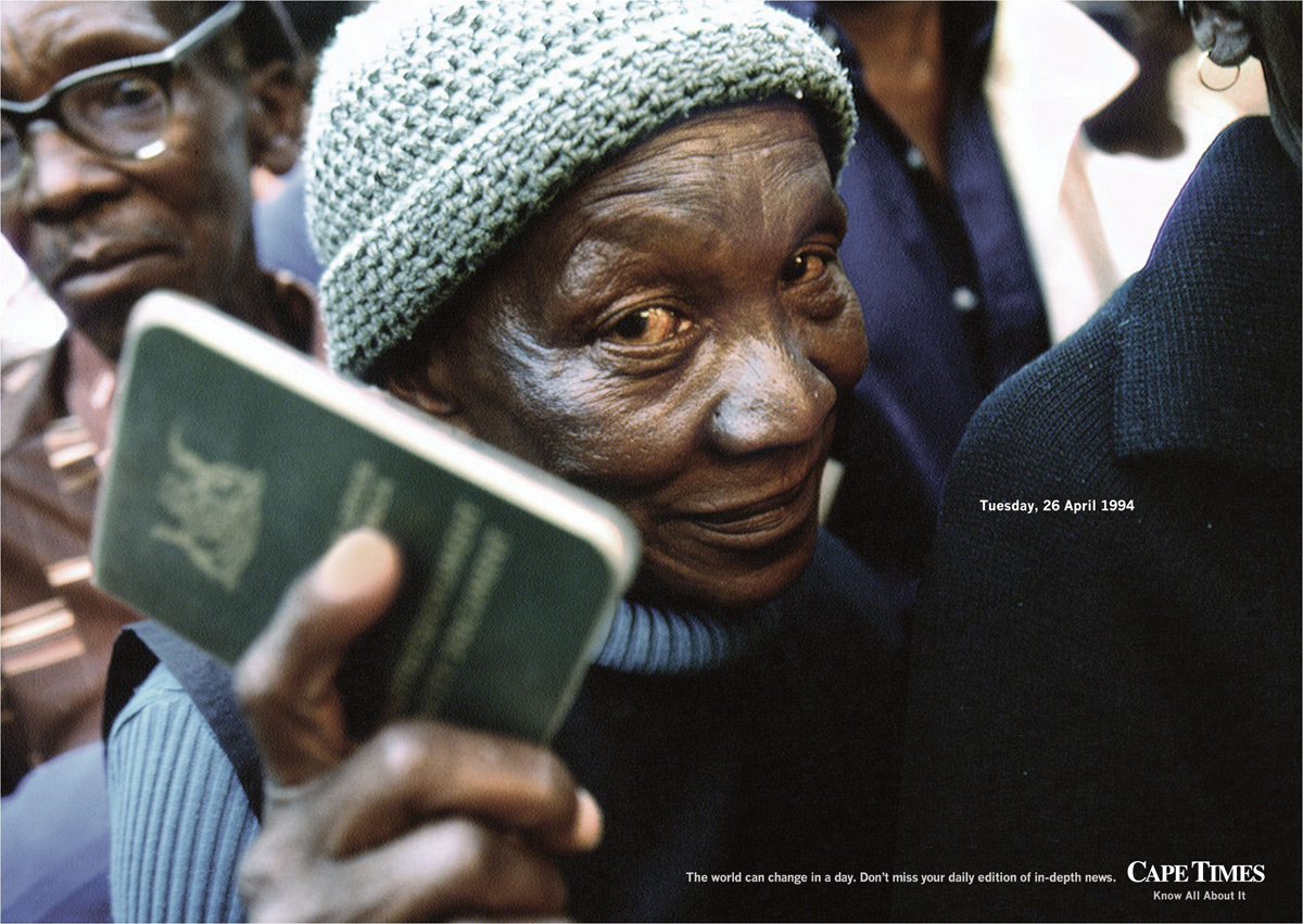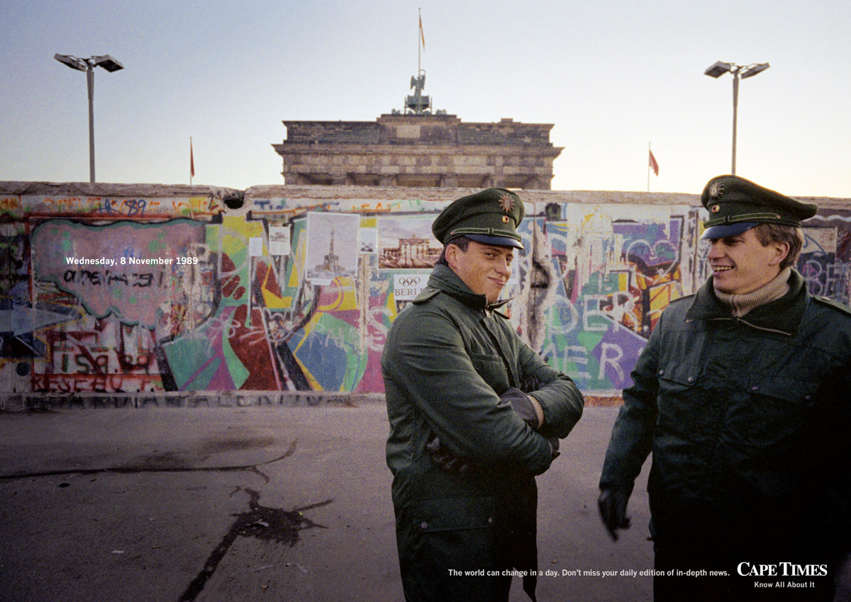 Мир изменчив. Каждый день несет что-то новое. CapeTimes не даст тебе пропустить самое важноеДля того чтобы подчеркнуть возможность стремительного развития событий и изменения мира в течение одного дня, агентство Lowe Bull, Cape Town поместило на принты берлинскую стену и африканскую женщину. Кто знает, что случится завтра? Не пропусти ключевые моменты в истории.Надпись: "Мир может измениться за день. Не пропусти свой ежедневный выпуск всесторонних новостей. CapeTimes " Состав творческой группы Рекламное агентство: Lowe Bull, Cape Town, South Africa Творческие директора: Kirk Gainsford, Alistair Morgan Арт директор: Brian Bainbridge Копирайтер: Simon Lotze Фотограф: Corbis |