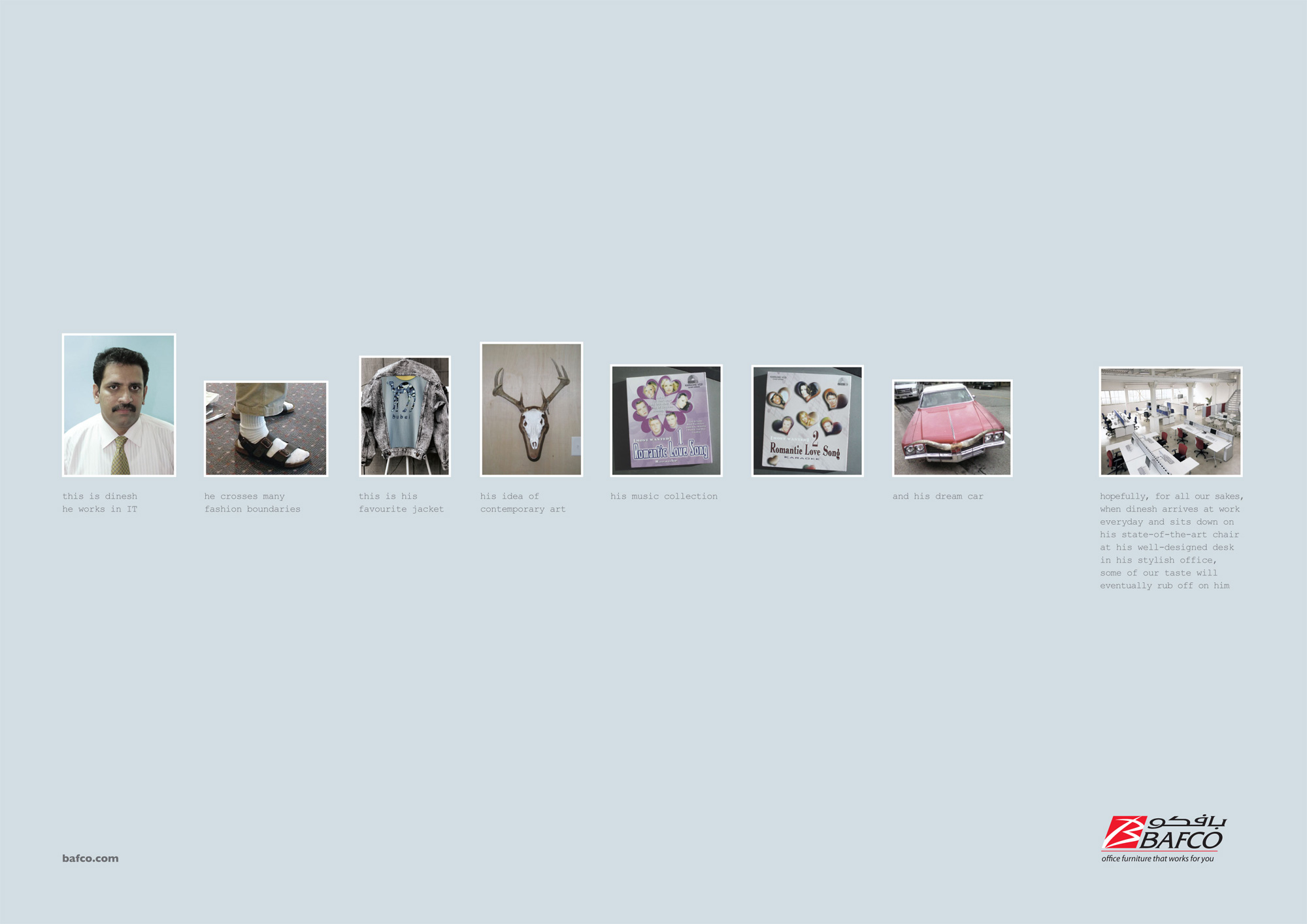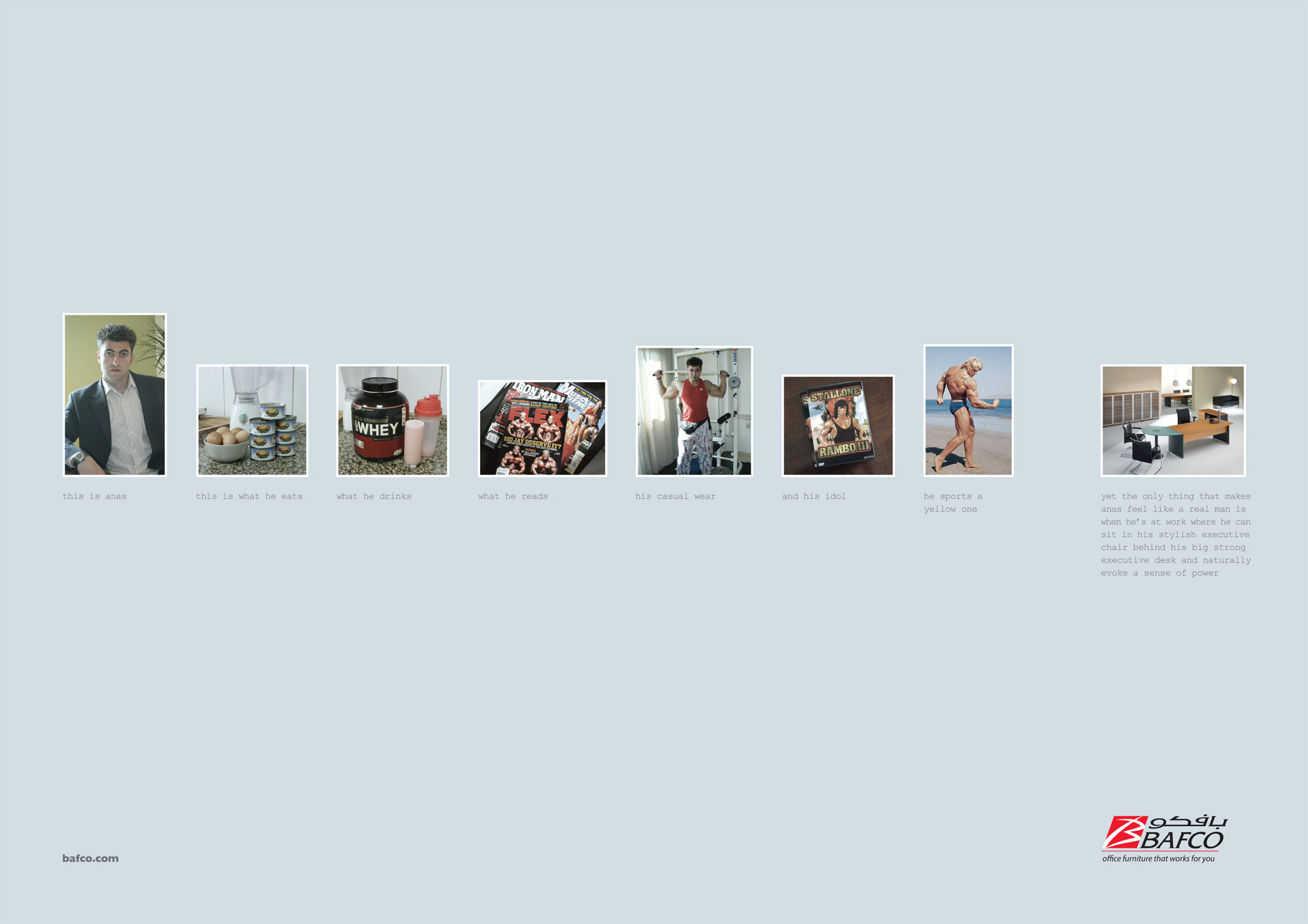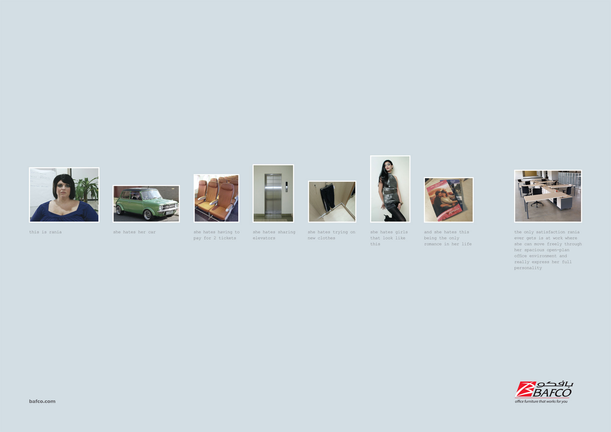 Офисная мебель Bafco может предотвратить самоубийствоОфисная мебель Bafco, как считает арабское рекламное агентство Tonic Communications, это не просто мебель. Стильные офисные столы и стулья способны поднять самомнение человека, предотвратить самоубийство, направить работников в правильное русло и заставить их чувствовать себя настоящими мужчинами.Надпись: "Это Рания. Она ненавидит свою машину. Она ненавидит необходимость платить за два билета. Она ненавидит лифты. Она ненавидит мерить новую одежду. Она ненавидит девушек, которые так выглядят. И она ненавидит это за то, что это единственная романтика в ее жизни. Единственное удовлетворение Рания получает на работе, где она может легко передвигаться по своему свободно распланированному офису и реально выражать всю полноту своей личности. Это Элиот. Он по-прежнему живет со своей матерью. Это его автомобиль. Это его лучший друг. Его развлечение. Как он тратит большую часть своего вечера. И это его работа. Единственное, что останавливает от Элиота от пуска пули в свою облысевшую голову среднего возраста, это то, что он каждый день приходит на работу, где он может быть более продуктивен на его эргономичном офисном стуле и может чувствовать себя реальным игроком. Это Динеш. Он работает в сфере ИТ. Он пересекает много модных границ. Это его любимая куртка. Его современное искусство. Его музыкальные коллекции. К счастью для всех нас, когда каждый день Динеш приходит на работу и садится на свой современный стул за свой хорошо продуманный стол в своем стильном офисе, некоторые из наших идей вдруг сказываются на нем. Это Анас. Это то, что он ест. То, что он пьет. То, что он читает. Его повседневная одежда. И его кумир. Он занимается спортом боязливо. Тем не менее, единственное, что заставляет Анаса чувствовать себя настоящим мужчиной, это когда он находится на работе, где может сидеть на своем стильном стуле за большим и сильным столом, вызывающем чувство власти." Агентство: Tonic Communications, Дубай, ОАЭ Творческий директор / Копирайтер: Винсент Раффрей (Vincent Raffray) Арт директор / Фотограф: Питер Уолкер (Peter Walker) |
