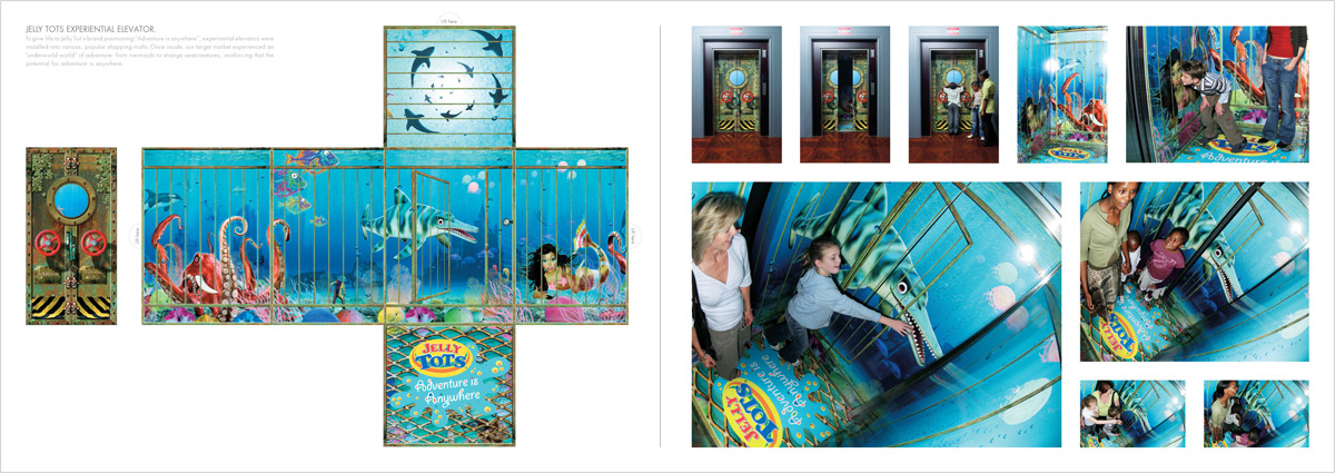 Мармелад Jelly Tots превратил лифты в сказочную странуЮжно-африканское рекламное агентство TBWA \ HuntLascaris предложило интересную акцию для рекламы популярного жевательного мармелада Jelly Tots. Лифты в нескольких торговых центрах были оформлены так, что ребенок, попадая внутрь, ощущал себя в сказочной подводной стране. Это ощущение должно было проиллюстрировать название кампании "Приключение повсюду".Агентство: TBWA \ HuntLascaris, ЮАР Главный творческий директор: Damon Stapleton Творческий директор: Bibi Lotter Арт директор: Chris Crawford, Kursten Meyer, Tammy Matisonn Копирайтер: Dan Parmenter |