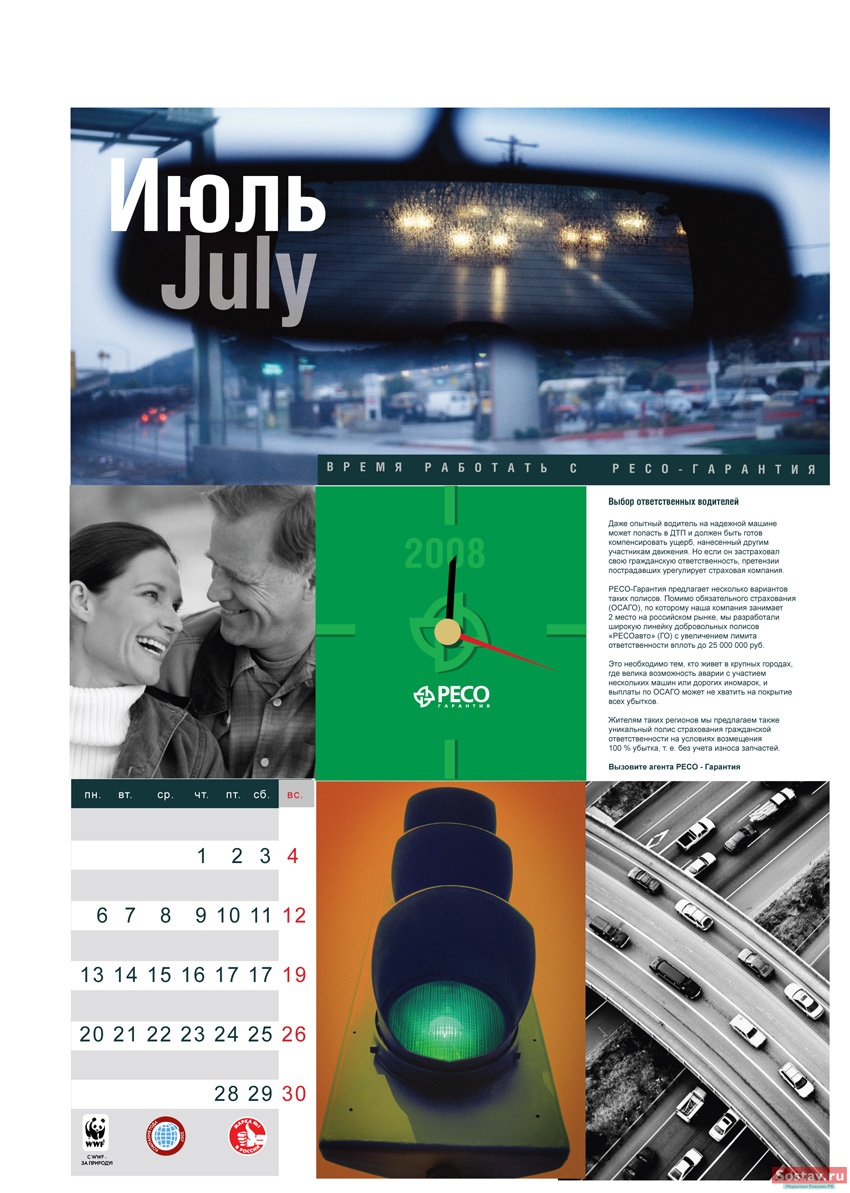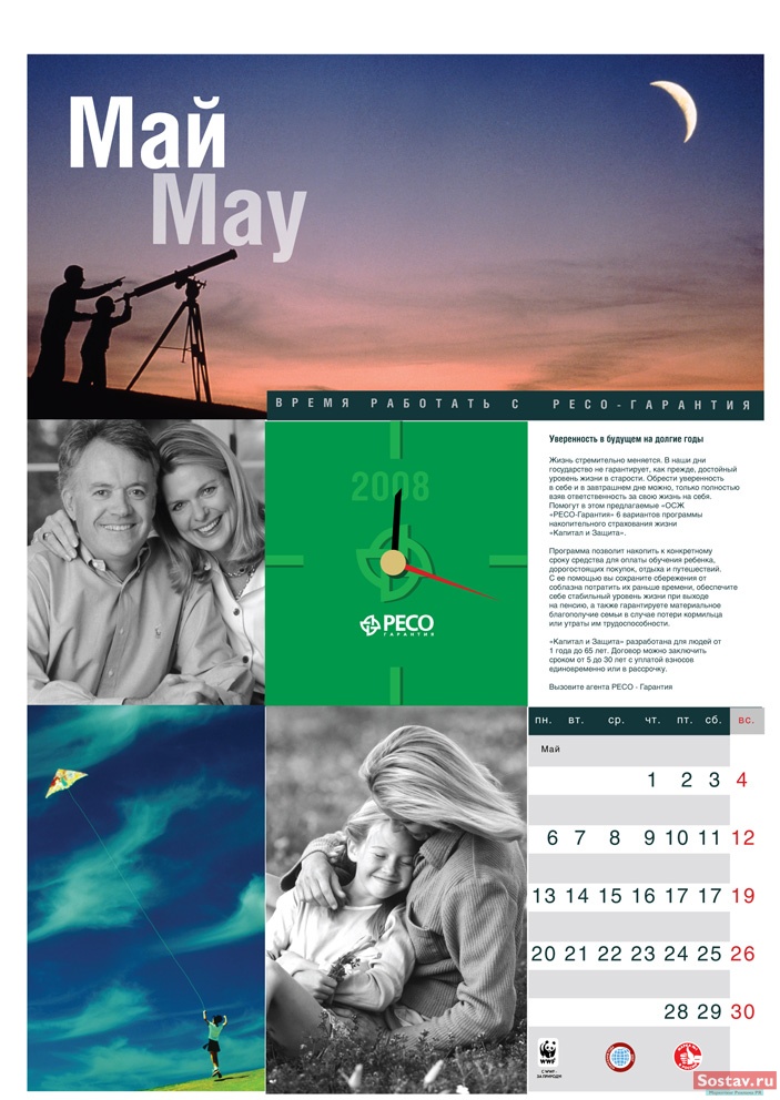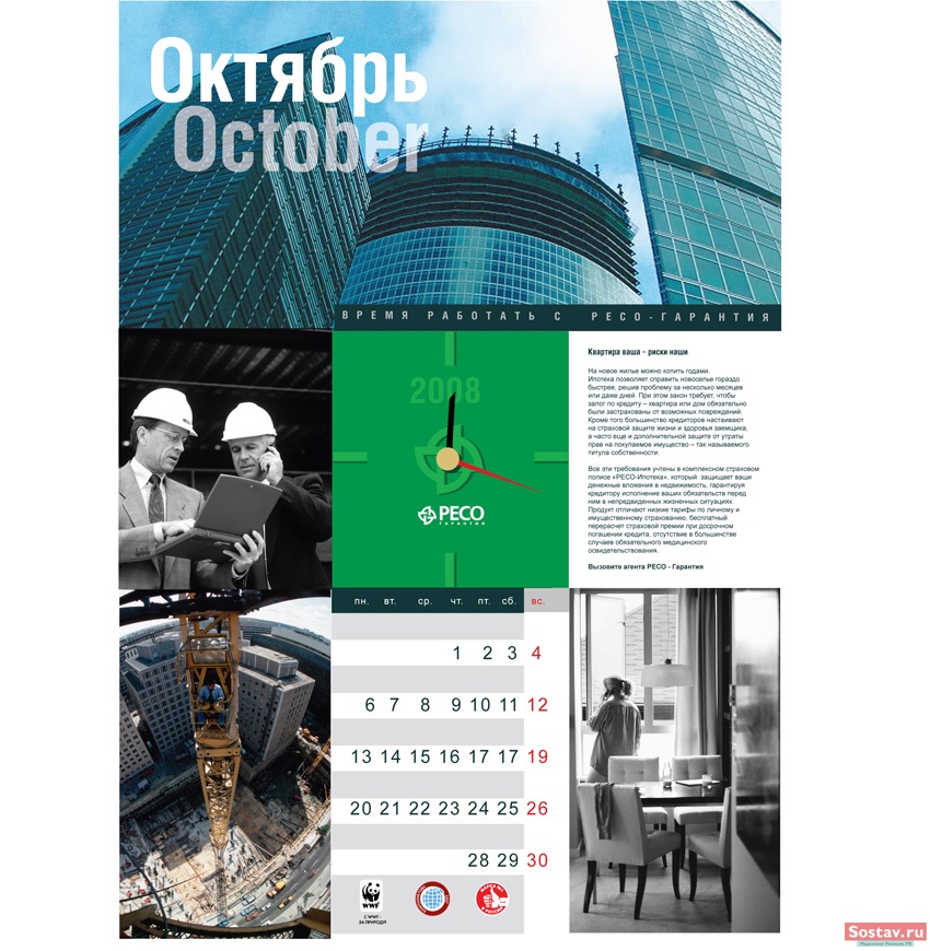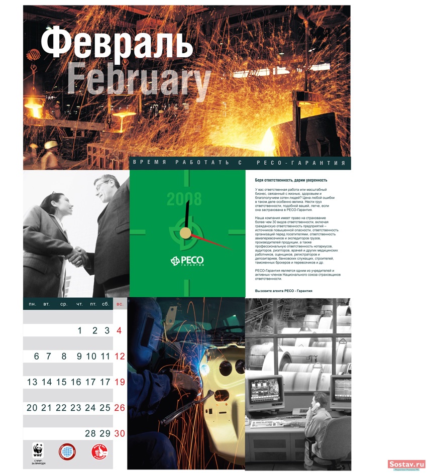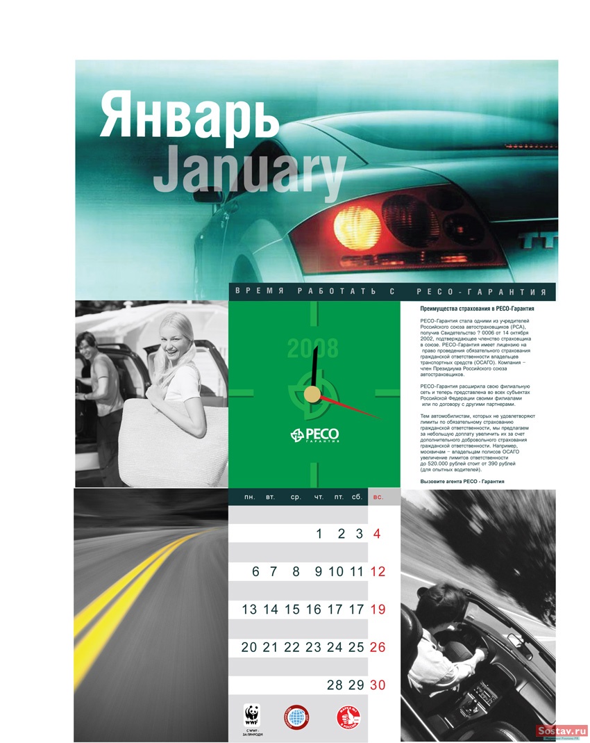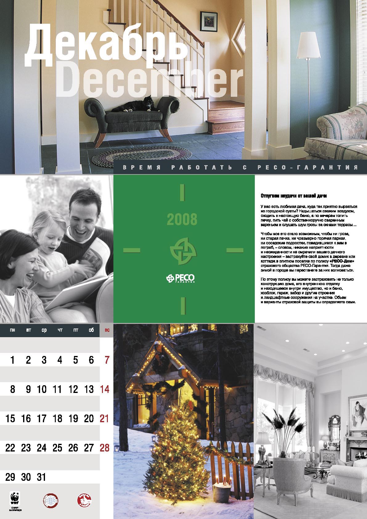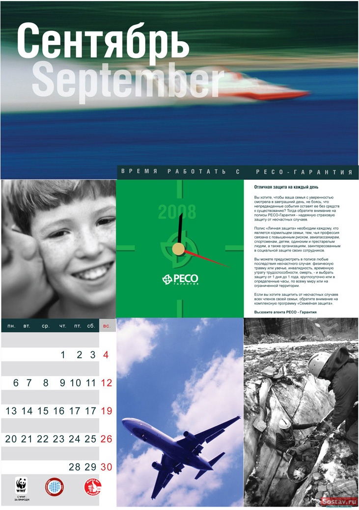 РА "ИМА-пресс" разработало нестандартный календарь для компании "РЕСО-гарантия"В основу креативной концепции календаря легла идея обыграть слоган компании "Время работать с РЕСО-гарантия". Для этого было предложено нестандартное решение: сделать по центру календарного листа вырубку и поместить туда настенные часы со стрелками. Функционально-символический стиль продолжен в оформлении страниц календаря, каждая из которых содержит описание одного из продуктов компании и соответствующие ему визуальные образы. В целом, календарь выполнен в фирменном стиле "РЕСО-гарантия", развитом и усовершенствованном дизайнерами РА "ИМА-пресс".Состав творческой группы Александр Панин - арт-директор, дизайн Наталья Людвиг - верстка Наталья Лысихина - менеджер проекта |