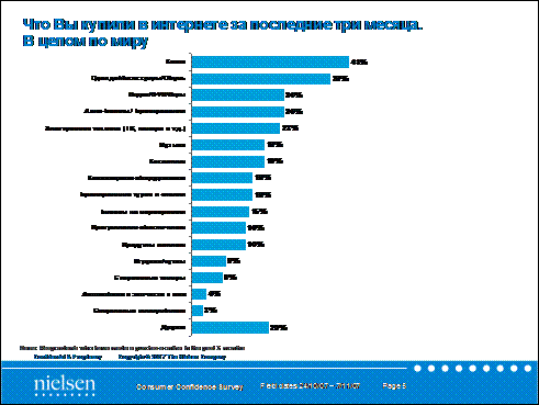 Более 875 миллионов потребителей делают покупки онлайн - за посление два года количество интернет-покупателей выросло на 40%Одежда и обувь - самый быстрорастущий сегмент в онлайн покупках. Карты "Visa" - самый популярный метод оплаты покупок в ИнтернетБолее 85 процентов онлайн-пользователей в мире делают покупки в сети Интернет. Таким образом, за последние два года количество интернет-покупателей в мире выросло на 40%. В России имеют опыт онлайн шоппинга 77% Интернет-пользователей. Таковы результаты глобального онлайн-исследования Nielsen (The Nielsen Company), посвященного изучению покупательского поведения потребителей в сети Интернет. В целом по миру за последний месяц что-либо купили в сети более половины опрошенных интернет-пользователей. "Интернет больше не является нишевой технологией - это мощное средство по-настоящему массовой информации, которое стало неотъемлемой частью жизни общества. Пожалуй, не осталось ни одной сферы нашей жизни, которая осталась бы без внимания онлайн-медиа. Темп жизни становится все интенсивнее, поэтому неудивительно, что потребители высоко оценили удобство Сети как средства изучения предложения товаров и место совершения покупок," - говорит Джонатан Карсон (Jonathan Carson), Президент подразделения Nielsen Online корпорации Nielsen. "Когда The Nielsen Company провела свое первое Глобальное исследование покупательского поведения в сети Интернет два года назад, покупки в онлайн делали порядка 10 процентов мирового населения (627 млн.), - говорит Брюс Пол, Вице-президент подразделения Специализированных исследований "Nielsen U.S". За последние два года, эта цифра возросла до 40% (875 млн.)". Больше всего приверженцев онлайн-шоппинга - в Южной Корее: здесь 99% регулярных интернет-пользователей ответили, что когда-либо использовали сеть для совершения покупок. Также на первых местах в списке стран с наибольшим числом Интернет-покупателей Великобритания (97%), Германия (97%), Япония (97%). Россия же пока далеко отстает от лидеров онлайн-шоппинга. Здесь 77% опрошенных делали когда-либо покупки в сети Интернет. Меньше - лишь в 12 из 48 стран, где проводился онлайн опрос. При этом, лишь 32% россиян, имеющих опыт онлайн шоппинга, ответили, что делали покупки в сети за последний месяц. К примеру, в Южной Корее за последний месяц покупали товары в Интернет 79 процентов (из тех, кто ответил, что покупал что-либо в сети), в Великобритании эта цифра составила 76%, в Швейцарии 67%. Самые популярные товары для онлайн-шоппинга в мире: Книги -- за последние три месяца их покупали 41% респондентов, Одежда/Аксессуары/Обувь (36%), Видео/ DVD / Игры (24%), Авиа-билеты (24%) и Электронная Техника (23%). В России в списке самых частых интернет-покупок также - Книги (42% респондентов), а еще Электронная техника (ТВ, камера и т.п.) (33%), Видео / DVD / Игры (29%), Музыка (23%), Программное обеспечение (23%). Количество интернет-покупателей книг в мире выросло на семь процентов за последние два года. "Одни из самых активных покупателей этого товара через Интернет -- жители развивающихся стран -- Китая, Бразилии, Вьетнама и Египта, что отражает огромный потенциал, который представляют эти быстрорастущие рынки для онлайн ритейлеров," - говорит Карсон. Но самый большой рост продемонстрировали Одежда/Аксессуары/Обувь: количество покупателей этих товаров в интернете выросло с 20% до 36%. В отличие от зрелых рынков с развитой интернет-торговл