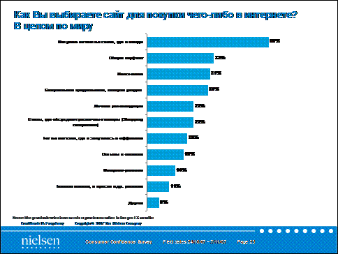 Источник: Nielsen Online, Декабрь 2007 Об исследовании Глобальное онлайн исследование Nielsen является крупнейшим интернет-проектом и проводится два раза в год с целью определить уровень доверия потребителей во всем мире, выявить основные источники беспокойства для потребителей, а также их привычки и намерения, связанные с приобретение товаров и услуг. Последняя волна исследования была проведена в конце октября - начале ноября среди 26 312 регулярных интернет-пользователей в 46 странах Европы, Азиатско-Тихоокеанского региона, Северной Америки, Балтии и Ближнего Востока. В России участники исследования представлены регулярными пользователями сети Интернет. Учитывая, что степень проникновения Интернет в России составляет около 20%, результаты опроса здесь смещены в сторону более образованной и обеспеченной аудитории. |