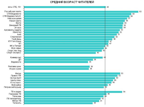 Газеты рекламных объявлений По оценке Дмитрия Канаева, в сегменте газет рекламных объявлений также все стабильно. «Из рук в руки» и «Реклама Шанс» востребованы на рынке, динамика их аудиторий – синхронная. Основываясь на данных МИК «Гортис», можно заметить, что средний возраст читателей по всем печатным изданиям составляют люди старше 30 лет. При этом самая молодая аудитория - у «Ведомостей» (35 лет), а самая возрастная - у «Российской газеты» (63).