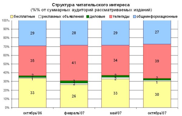 Наиболее востребованными среди читателей по-прежнему остаются телегиды, аудитория которых в октябре 2007 года составляла 39% от суммарной аудитории всех рассматриваемых изданий. Второе место по популярности удерживают бесплатные издания (30%), замыкают тройку лидеров с 27% общеинформационные издания. На долю же деловых газет и газет бесплатных объявлений остались лишь 2 и 1%, соответственно.