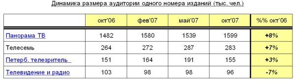Телегиды Спрос на издания с телевизионной программой традиционно высок, и на данный момент это - самый активно развивающийся сегмент печатной продукции. К тому же в последнее время каждое издание работает над улучшением своего внешнего вида (полиграфии) и увеличением содержательной части - количество страниц в телегидах растёт с каждым полугодием. Безоговорочным лидером рынка в этом сегменте, по словам Дмитрия Канаева, по-прежнему выступает «Панорама ТВ», что обусловлено, прежде всего, огромным тиражом в 1,2 млн. экземпляров. Тиражи прочих ведущих изданий подобного формата значительно меньше – 130-350 тыс. экземпляров. В 2006 году в этом сегменте появился новый сильный игрок – Metro TV - бесплатный телегид с тиражом 300 тыс. экземпляров, который можно взять у метро по четвергам. «Без сомнения, это внесёт определенные перемены в распределение сил, но, как представляется, позиции «Панорамы ТВ» новый телегид поколебать не сможет по причине её «масштабности», - считает Дмитрий Канаев. За год с октября 2006 по октябрь 2007 года аудитория одного читательского номера у лидирующих в данном сегменте изданий выросла – у «Панорамы ТВ» на 8%, у «Телесемь» на 7%, у «Петербургского телезрителя» на 3%. А вот «Телевидение и радио», наоборот, потеряло 7% аудитории одного номера.
