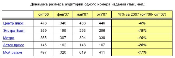 Бесплатные газеты В данном сегменте бесспорным лидером года согласно исследованиям МИК «Гортис» была газета «Мой район». «Бесплатные издания рекламного характера – «Центр Плюс» и «Экстра Балт» уже более года с трудом сдерживают конкуренцию, только благодаря большим тиражам», - говорит Дмитрий Канаев. Отметим, что только по Петербургу (без учёта ЛО и пригородов) тираж газеты «Мой район» составляет 430 тыс. экземпляров, «Центр Плюса» - 1.3 млн., а «Экстра Балта» – 1.1 млн., то есть, в 2,5-3 раза меньше. Среди бесплатных газет, большая часть тиража которых раздается у метро, отмечается такая же тенденция: аудитория информационного издания Metro – стабильно высокая, а рекламные «Асток» и прочие с каждым месяцем становятся всё менее востребованными. Таким образом, в качестве основной тенденции в сегменте бесплатных газет специалисты МИК «Гортис» выделяют тот факт, что спрос всё более ориентирован в сторону изданий с контентом. При этом у бесплатных изданий наблюдается отток аудитории одного номера. За год с октября 2006 года по октябрь 2007 года каждая из газет потеряла от 6% («Центр Плюс») до 26% («Асток пресс»).