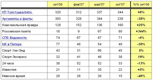 Общеинформационные и развлекательные газеты На данный момент общеинформационные и развлекательные газеты находятся в самом сложном положении - средством оперативного информирования они уже быть перестали, а среди всевозможных способов развлечения они не стоят на первых позициях, проигрывая Интернету и телевидению. Хотя, по-прежнему, высока их востребованность в дороге. «В такой ситуации выходом, как представляется, является переориентация содержания в сторону городских проблем и вопросов, подробному освещению различных аспектов жизни людей (открытие новых заведений культурно-развлекательного и торгового плана, описание новинок техники, тенденций моды, рецензии на книги, кино, музыку и т.п.), ответам на конкретные вопросы горожан», - считает Дмитрий Канаев. За 2007 год существенно пошатнулась позиция «Аргументов и фактов»: из лидера этого сегмента газета опустилась на 2 строчку, потеряв 40% своих читателей, и теперь её аудитория в 1,4 раза меньше, чем у «Толстушки КП». Уменьшились аудитории у большинства ведущих информационных городских газет – «СПб Ведомости», «Смена», «Невское время», «МК в Питере». Только позиции «Комсомольской правды» пока выглядят абсолютно незыблемыми.