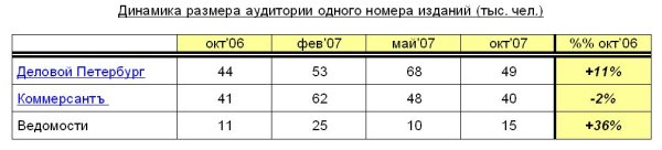 Деловые газеты Сегмент деловых газет стабилен как по составу изданий, так и по спросу на издания. Аудитория у лидеров – «Деловой Петербург» (+11%) и «Коммерсант» (-2%) в целом за год с октября 2006 по октябрь 2007 осталась прежней. «Ведомости» же добавили за этот год 36% читательской аудитории одного номера.